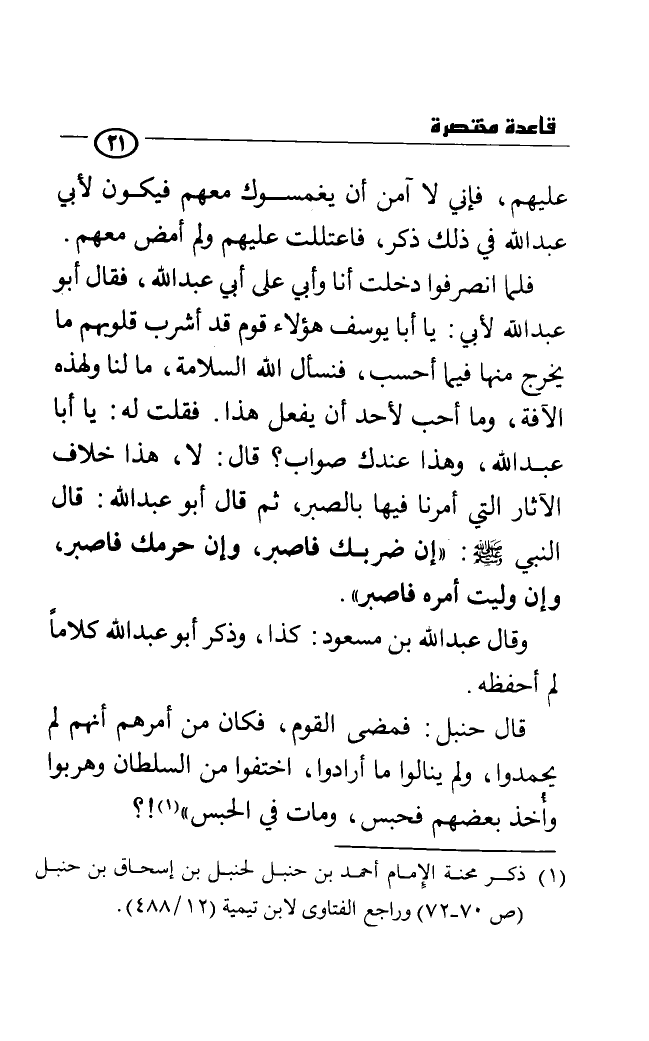 فلما انصرفوا دخلت أنا وأبي على أبي عبد الله، فقال أبو عبد الله لأبي: يا أبا يوسف هؤلاء قوم قد أشرب قلوبهم ما يخرج منها فيما أحسب، فنسأل الله السلامة، ما لنا ولهذه الآفة، وما أحب لأحد أن يفعل هذا. فقلت له: يا أبا عبد الله، وهذا عندك صواب؟ قال: لا، هذا خلاف الآثار التي أمرنا فيها بالصبر، ثم قال أبو عبد الله: قال النبي صلى الله عليه وسلم: "إن ضربك فاصبر، وإن حرمك فاصبر، وإن وليت أمره فاصبر".