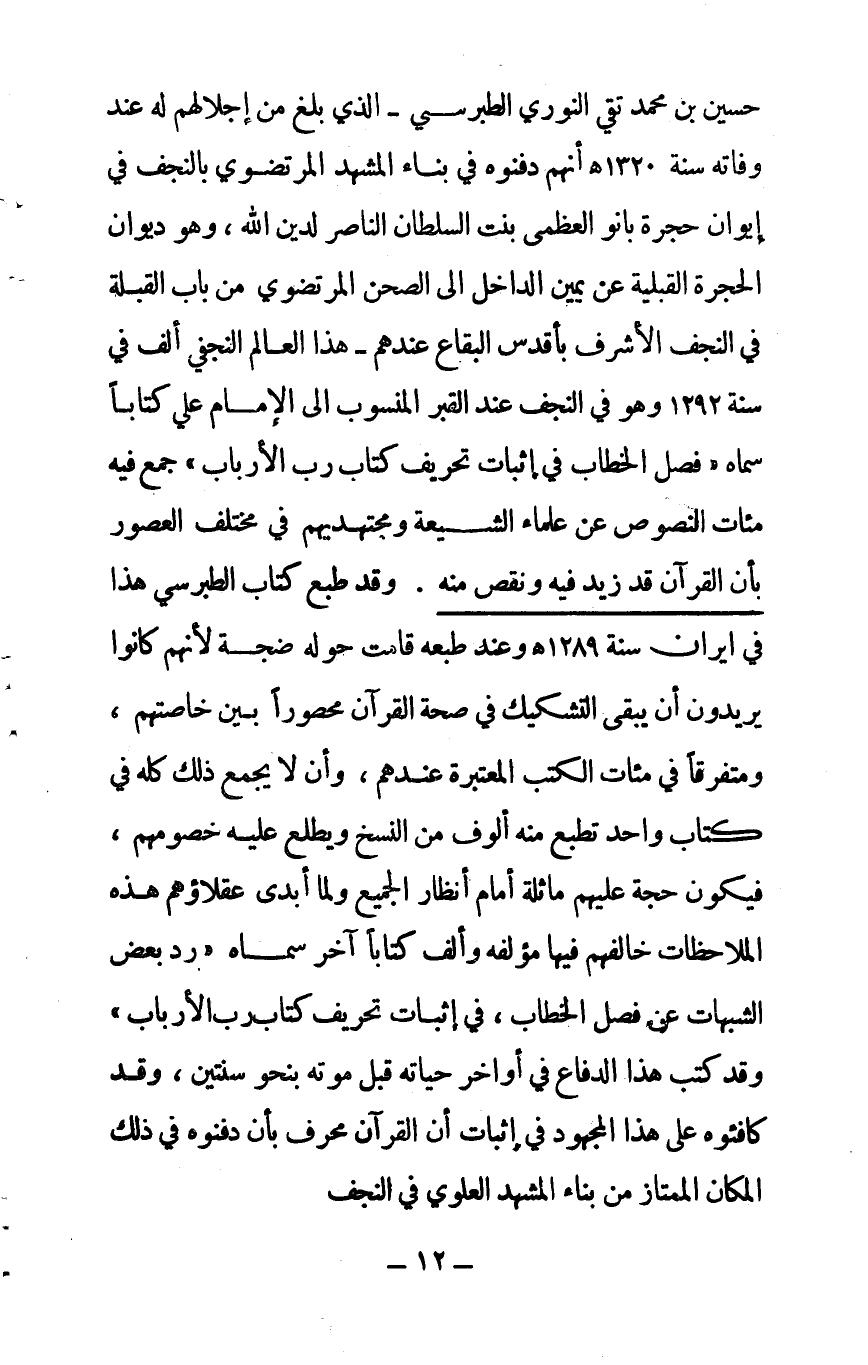 حسين بن محمد تقي النوري الطبرسي -الذي بلغ من إجلالهم له عند وفاته سنة 1320هـ أنهم دفنوه في بناء المشهد المرتضوي بالنجف في إيوان حجرة بانوا العظمى، بنت السلطان الناصر لدين الله، وهو ديوان الحجرة القبلية عن يمين الداخل إلى الصحن المرتضوي من باب القبلة في النجف بأقدس البقاع عندهم- هذا العالم النجفي ألف في سنة 1292هـ وهو في النجف عند القبر المنسوب إلى الإمام علي كتابا سماه: "فصل الخطاب في إثبات تحريف كتاب رب الأرباب" جمع فيه مئات النصوص عن علماء الشيعة ومجتهديهم في مختلف العصور بأن القرآن قد زيد فيه ونقص منه. وقد طبع كتاب الطبرسي هذا في إيران سنة 1298هـ وعند طبعه قامت حوله ضجة لأنهم كانوا يريدون أن يبقى التشكيك في صحة القرآن محصوراً في خاصتهم ومتفرقا في مئات الكتب المعتبرة عندهم، وأن لا يجمع ذلك كله في كتاب واحد، تطبع منه ألوف من النسخ، ويطلع عليه خصومهم، فيكون حجة عليهم ماثلة أمام أنظار الجميع، ولما أبدى عقلاؤهم هذه الملاحظات خالفهم فيها مؤلفه وألف كتاباً آخر سماه "رد بعض الشبهات عن فصل الخطاب في إثبات تحريف كتاب رب الأرباب" وقد كتب هذا الدفاع في أواخر حياته قبل موته بنحو سنتين، وقد كافئوه على هذا المجهود في إثبات أن القرآن محرف، بأن دفنوه في ذلك المكان الممتاز من بناء المشهد العلوي في النجف.