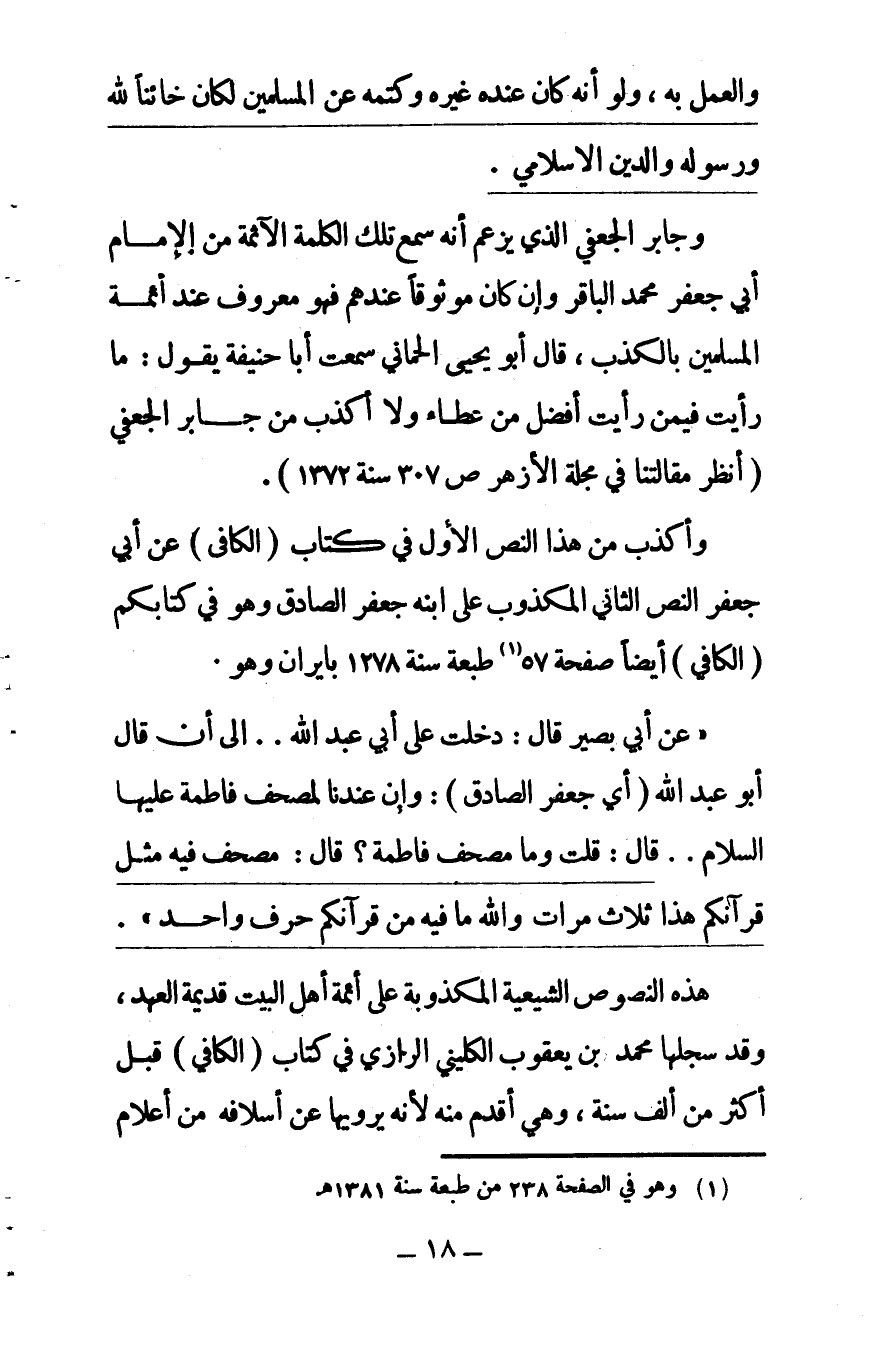 وأكذب من هذا النص الأول في كتاب (الكافي) عن أبي جعفر، النص الثاني المكذوب على ابنه جعفر الصادق، وهو في بخاريهم (الكافي) أيضاً صفحة 57 طبعة سنة 1278 بإيران وهو: "عن أبي بصير قال: دخلت على أبي عبد الله .. إلى أن قال أبو عبد الله (أي جعفر الصادق): وإن عندنا لمصحف فاطمة عليها السلام ... قال: قلت وما مصحف فاطمة؟ قال: مصحف فيه مثل قرآنكم هذا ثلاث مرات، والله ما فيه من قرآنكم حرف واحد".!