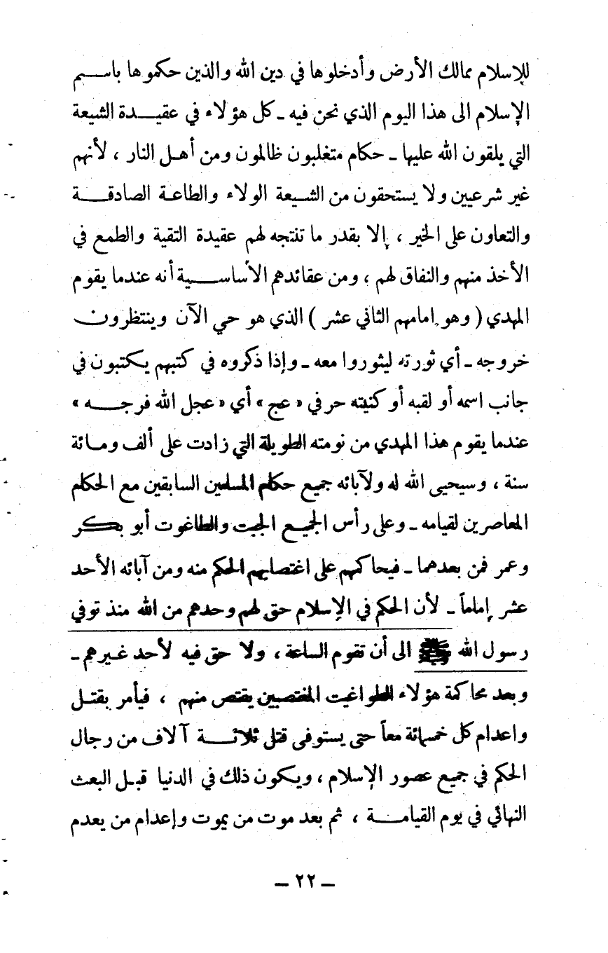 للإسلام ممالك الأرض وأدخلوها في دين الله، والذين حكموها باسم الإسلام إلى هذا اليوم الذي نحن فيه -كل هؤلاء في عقيدة الشيعة التي يلقون الله عليها- حكام متغلبون ظالمون ومن أهل النار، لأنهم غير شرعيين ولا يستحقون من الشيعة الولاء والطاعة الصادقة والتعاون على الخير إلا بقدر ما تنتجه لهم عقيدة التقية والطمع في الأخذ منهم والمداجاة لهم. ومن عقائدهم الأساسية أنه عندما يقوم المهدي (وهو إمامهم الثاني عشر) الذي هو حي الآن (بزعمهم) وينتظرون خروجه -أي ثورته ليثوروا معه- وإذا ذكروه في كتبهم يكتبون في جانب اسمه حرفي "عج" أي "عجل الله فرجه" عندما يقوم هذا المهدي من نومته الطويلة التي زادت على ألف ومائة سنة، وسيحيي الله له ولآبائه جميع حكام المسلمين السابقين مع الحكام المعاصرين لقيامه -وعلى رأس الجميع أبوبكر وعمر فمن بعدهما- فيحاكمهم على اغتصابهم الحكم منه، ومن آبائه الأحد عشر إماما -لأن الحكم في الإسلام حق لهم وحدهم من الله منذ توفي رسول الله صلى الله عليه وسلم إلى أن تقوم الساعة، ولا حق فيه لأحد غيرهم -وبعد محاكمة هؤلاء الطواغيت المغتصبين يقتص منهم فيأمر بقتل وإعدام كل خمسمائة معاً حتى يستوفي في قتل ثلاثة آلاف من رجال الحكم في جميع عصور الإسلام، ويكون ذلك في الدنيا قبل البعث النهائي في يوم القيامة، ثم بعد موت من يموت وإعدام من يعدم