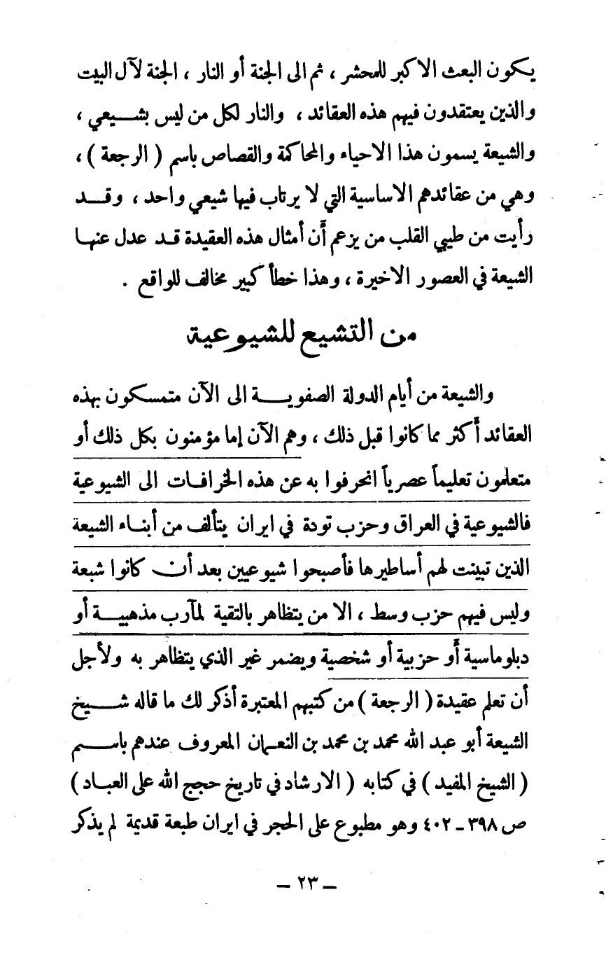 والشيعة من أيام الدولة الصفوية إلى الآن متمسكون بهذه العقائد أكثر مما كانوا قبل ذلك، وهم الآن إما مؤمنون بكل ذلك، أو متعلمون تعليماً عصريا، انحرفوا به عن هذه الخرافات إلى الشيوعية، فالشيوعية في العراق وحزب تودة في إيران يتألف من أبناء الشيعة الذين تبينت لهم أساطيرها، فأصبحوا شيوعيين بعد أن كانوا شيعة، وليس فيهم حزب وسط، إلا من يتظاهر بالتقية لمآرب مذهبية أو دبلوماسية أو حزبية أو شخصية ويضمر غير الذي يتظاهر به، ولأجل أن تعلم عقيدة (الرجعة) من كتبهم المعتبرة أذكر لك ما قاله شيخ الشيعة أبو عبد الله محمد بن محمد بن النعمان المعروف عندهم باسم (الشيخ المفيد) في كتابه (الإرشاد في تأريخ حجج الله على العباد) ص398 - 402 وهو مطبوع على الحجر في إيران طبعة قديمة، لم يذكر