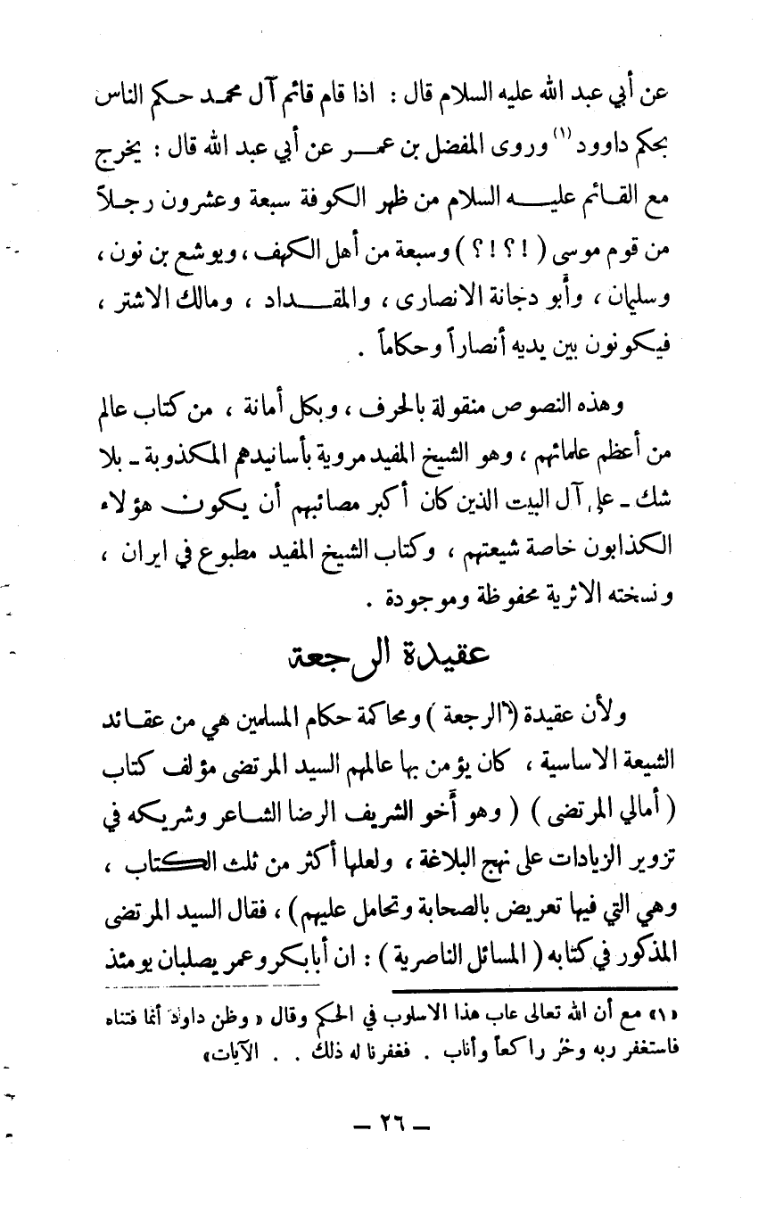 وهذه النصوص منقولة بالحرف، وبكل أمانة من كتاب عالم من أعظم علمائهم وهو الشيخ المفيد، مروية بأسانيدهم المكذوبة -بلا شك- على آل البيت الذين كان من أكبر مصائبهم أن يكون هؤلاء الكذابون خاصة شيعتهم، وكتاب المفيد مطبوع في إيران ونسخته الأثرية محفوظة وموجودة.