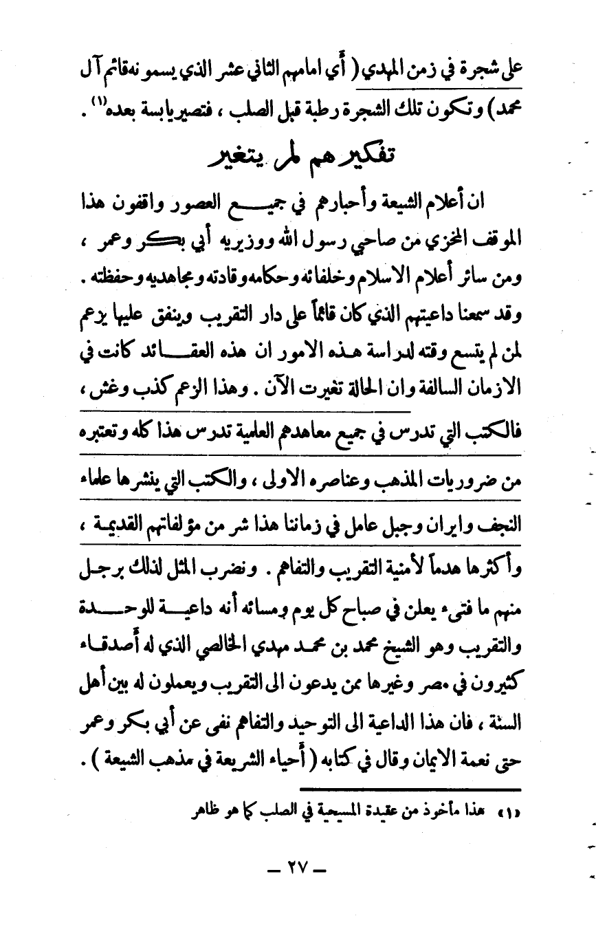 إن أعلام الشيعة وأحبارهم في جميع العصور واقفون هذا الموقف المخزي من صاحبي رسول الله ووزيريه أبي بكر وعمر ومن سائر أعلام الإسلام وخلفائه وحكامه وقادته ومجاهديه وحفظته. وقد سمعنا داعيتهم الذي كان قائما على دار التقريب، وينفق عليها يزعم لمن لم يتسع وقته لدراسة هذه الأمور أن هذه العقائد كانت في الأزمان السالفة وأن الحالة تغيرت الآن. وهذا الزعم كذب وغش فالكتب التي تدرَّس في جميع معاهدهم العلمية تدرِّس هذا كله وتعتبره من ضروريات المذهب وعناصره الأولى، والكتب التي ينشرها علماء النجف وإيران وجبل عامل، في زماننا هذا شر من مؤلفاتهم القديمة وأكثرها هدماً لأمنية التقريب والتفاهم. ونضرب المثل لذلك برجل منهم ما فتيء يعلن في صباح كل يوم ومسائه أنه داعية للوحدة والتقريب وهو الشيخ محمد ابن محمد مهدي الخالصي، الذي له أصدقاء كثيرون في مصر، وغيرها ممن يدعون إلى التقريب، ويعملون له بين أهل السنة، فإن هذا الداعية إلى التقريب والتفاهم نفى عن أبي بكر وعمر حتى نعمة الإيمان وقال في كتابه (إحياء الشريعة في مذهب الشيعة)