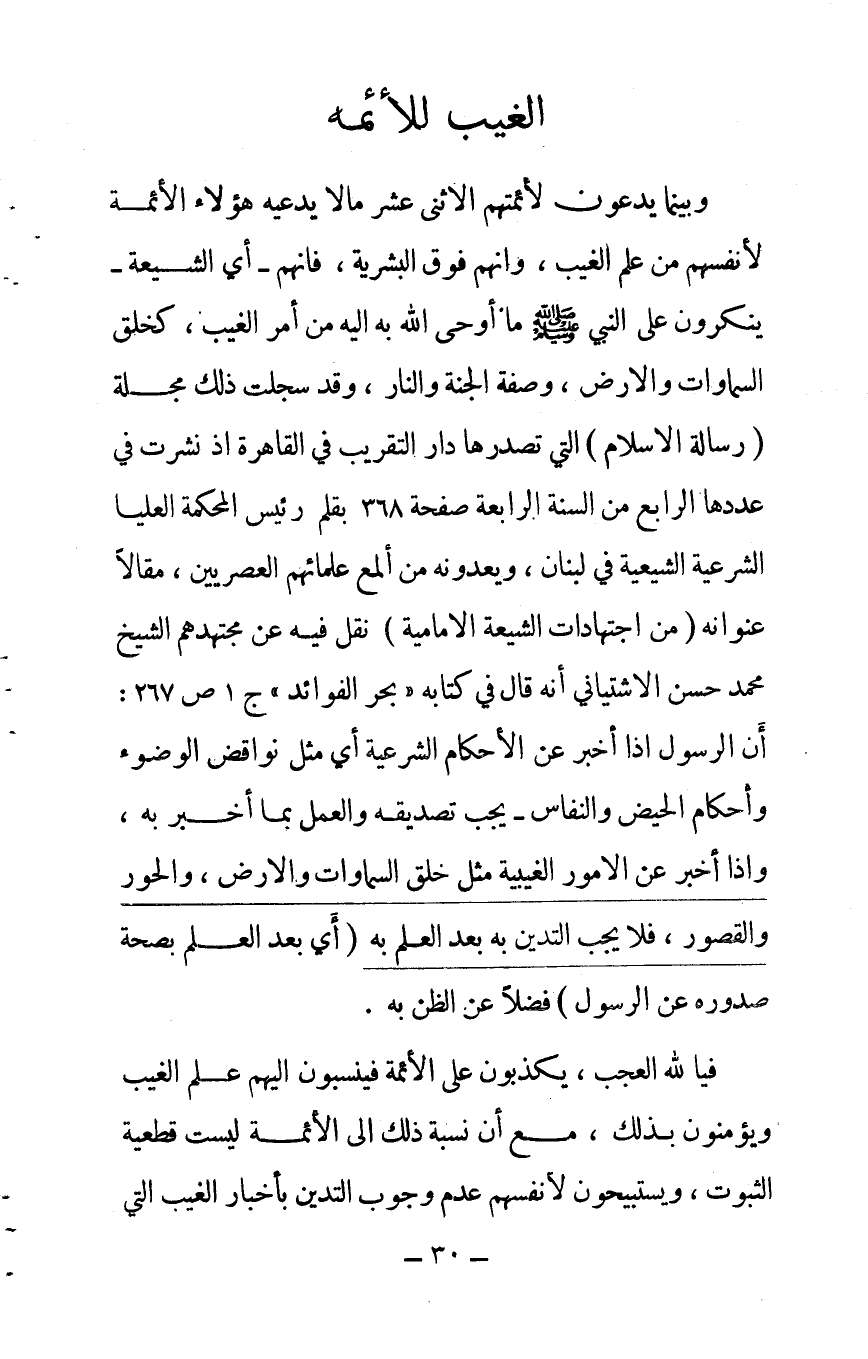 وبينما يدّعون لأئمتهم الاثني عشر ما لا يدعيه هؤلاء الأئمة لأنفسهم من علم الغيب، وأنهم فوق البشرية فإنهم -أي الشيعة- ينكرون على النبي صلى الله عليه وسلم ما أوحى الله به إليه من أمر الغيب، كخلق السماوات والأرض وصفة الجنة والنار. وقد سجلت ذلك مجلة (رسالة الإسلام) التي تصدرها دار التقريب في القاهرة إذ نشرت في عددها الرابع من السنة الرابعة صفحة 368 بقلم رئيس المحكمة العليا الشرعية الشيعية في لبنان، ويعدونه من ألمع علمائهم العصريين، مقالاً عنوانه: (من اجتهادات الشيعة الإمامية) نقل فيه عن مجتهدهم الشيخ محمد حسن الأشتياني أنه قال في كتابه (بحر الفوائد) ج1 ص267: أن الرسول صلى الله عليه وسلم إذا أخبر عن الأحكام الشرعية أي مثل نواقض الوضوء وأحكام الحيض والنفاس -يجب تصديقه والعمل بما أخبر به وإذا أخبر عن الأمور الغيبية مثل خلق السماوات والأرض والحور والقصور فلا يجب التدين به بعد العلم به (أي بعد العلم بصحة صدوره عن الرسول صلى الله عليه وسلم) فضلاً عن الظن به.