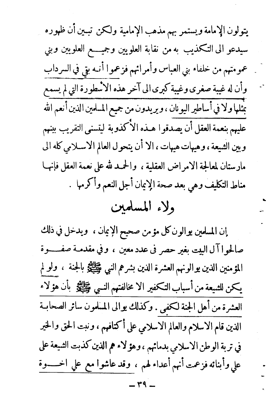 يتولون الإمامة، ويستمر بهم مذهب الإمامية، ولكن تبين أن ظهوره سيدعوا إلى التكذيب به من نقابة العلويين، وجميع العلويين، وبني عمومتهم من خلفاء بني العباس، وأمرائهم، فزعموا أنه بقي في السرداب، وأن له غيبة صغرى، وغيبة كبرى إلى آخر هذه الأسطورة التي لم يسمع مثلها ولا في أساطير اليونان، ويريدون من جميع المسلمين الذين أنعم الله عليهم بنعمة العقل أن يصدقوا هذه الأكذوبة ليتسنى التقريب بينهم وبين الشيعة وهيهات هيهات! إلا أن يتحول العالم الإسلامي كله إلى "مارستان" لمعالجة الأمراض العقلية، والحمد لله على نعمة العقل فإنها مناط التكليف، وهي بعد صحة الإيمان أجلّ النعم وأكرمها.