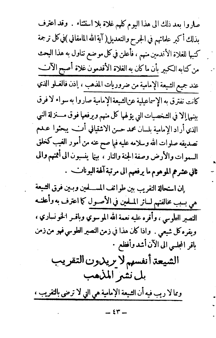 إن استحالة التقريب بين طوائف المسلمين وبين فرق الشيعة هي بسبب مخالفتهم لسائر المسلمين في الأصول كما اعترف به وأعلنه النصير الطوسي، وأقره عليه نعمة الله الموسوي وباقر الخونساري، ويقره كل شيعي. وإذا كان هذا في زمن النصير الطوسي فهو من زمن باقر المجلسي إلى الآن أشد وأفظع.