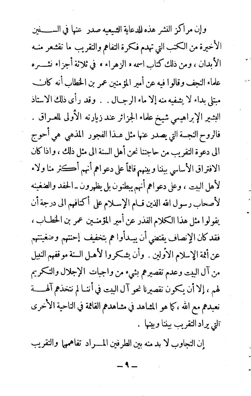 وإن مراكز النشر هذه للدعاية الشيعية صدر عنها في السنين الأخيرة من الكتب التي نهدم فكرة التفاهم والتقريب ما تقشعر منه الأبدان، ومن ذلك كتاب اسمه "الزهراء" في ثلاثة أجزاء نشره علماء النجف وقالوا فيه عن أمير المؤمنين عمر بن الخطاب إن كان مبتلى بداء لا يشفيه منه إلا ماء الرجال (!) وقد رأى ذلك الأستاذ البشير الإبراهيمي، شيخ علماء الجزائر عند زيارته الأولى للعراق (¬1). فالروح النجسة التي يصدر عنها مثل هذا الفجور المذهبي هي أحوج إلى دعوة التقريب إلى حاجتنا نحن أهل السنة إلى مثل ذلك. وإذا كان الافتراق الأساسي بيننا وبينهم قائماً على دعواهم أنهم أكثر منا ولاءً لأهل البيت، وعلى دعواهم أنهم يبطنون -بل يظهرون- الحقد والضغينة لأصحاب رسول الله صلى الله عليه وسلم الذين قام الإسلام على أكتافهم إلى درجة أن يقولوا مثل هذا الكلام القذر عن أمير المؤمنين عمر بن الخطاب رضي الله عنه، فقد كان الإنصاف يقتضي أن يبدءوا هم بتخفيف أحنتهم وضغينتهم عن أئمة الإسلام الأولين. وأن يشكروا لأهل السنة موقفهم النبيل من آل البيت وعدم تقصيرهم بشيء من واجبات الإجلال والتكريم لهم، إلا أن يكون تقصيرنا نحو آل البيت في أننا لم نتخذهم آلهة نعبدهم مع الله، كما هو مشاهد في مشاهدهم القائمة في الناحية الأخرى التي يراد التقريب بيننا وبينها.