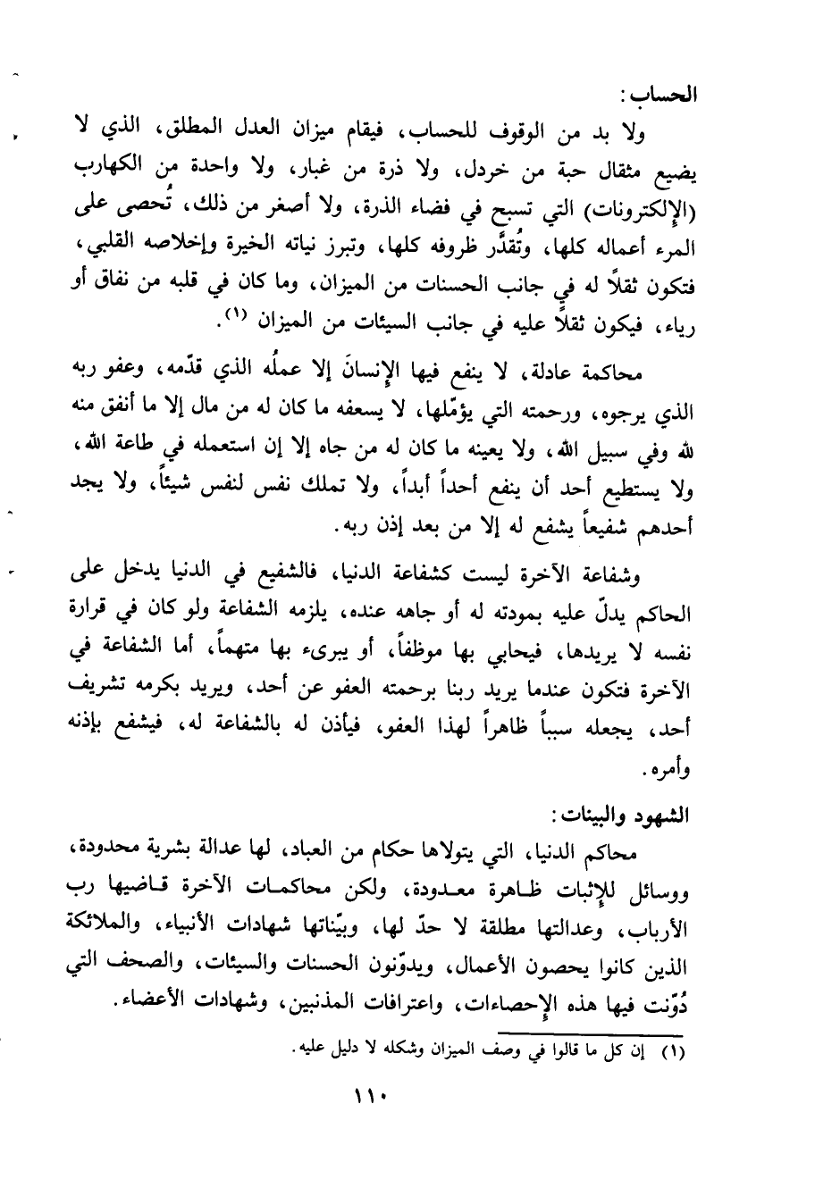ولا بد من الوقوف للحساب، فيقام ميزان العدل المطلق، الذي لا يضيع مثقال حبة من خردل، ولا ذرة من غبار، ولا واحدة من الكهارب (الالكترونات) التي تسبح في فضاء الذرة، ولا أصغر من ذلك. تحصى على المرء أعماله كلها، وتقدر ظروفه كلها، وتبرز نياته الخيرة واخلاصه القلبي، فتكون ثقلا له في جانب الحسنات من الميزان، وما كان في قلبه من نفاق أو رياء، فيكون ثقلا عليه في جانب السيئات من الميزان (¬1).