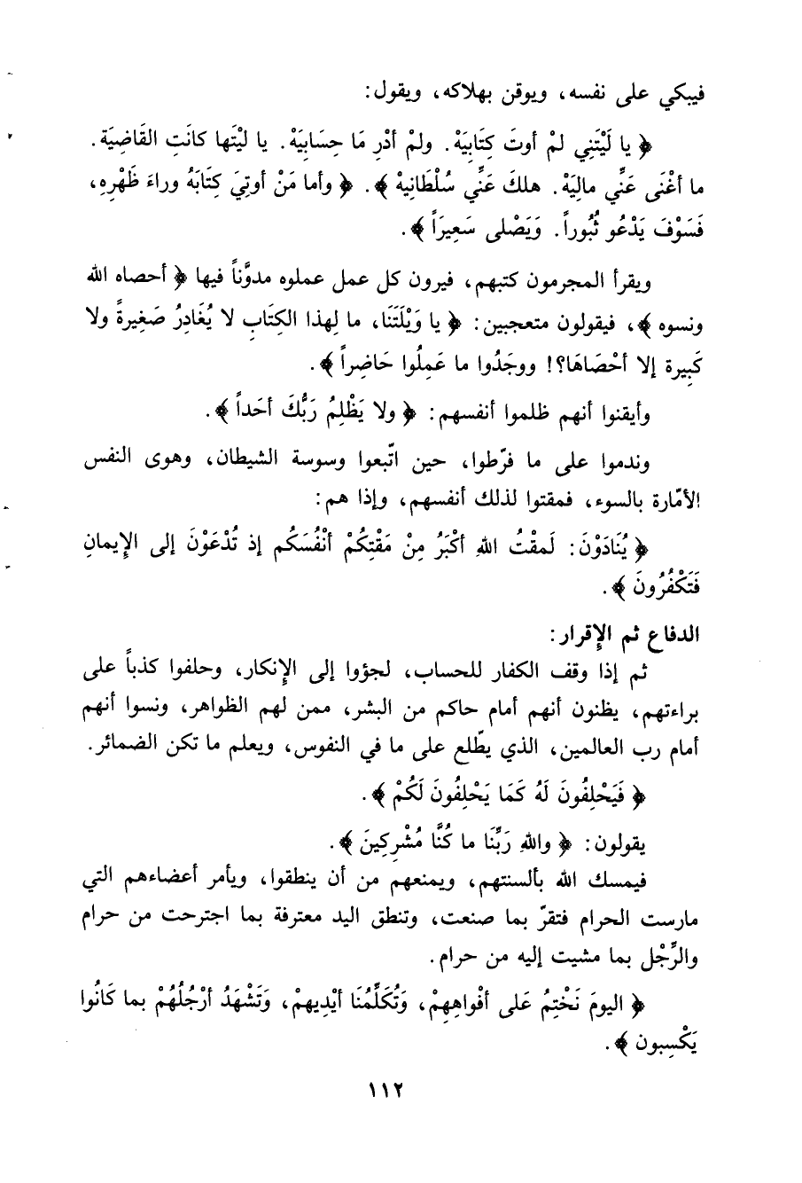 فيمسك الله بألسنتهم، ويمنعهم من أن ينطقوا، ويأمر أعضاءهم التي مارست الحرام فتقر بما صنعت، تنطق اليد معترفة بما اجترحت من حرام، والرجل بما مشت اليه من حرام.