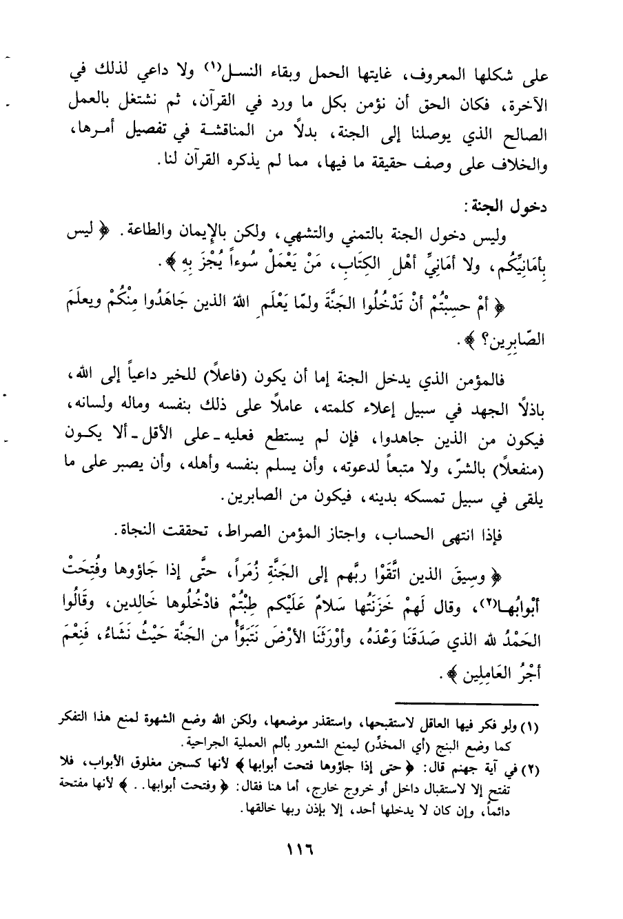 على شكلها المعروف، غايتها الحمل وبقاء النسل (¬1)، ولا داعي لذلك في الآخرة، فكان الحق أن نؤمن بكل ما ورد في القرآن، ثم نشتغل بالعمل الصالح الذي يوصلنا إلى الجنة، بدلا من المناقشة في تفصيل أمرها، والخلاف على وصف حقيقة ما فيها، مما لم يذكره القرآن لنا.