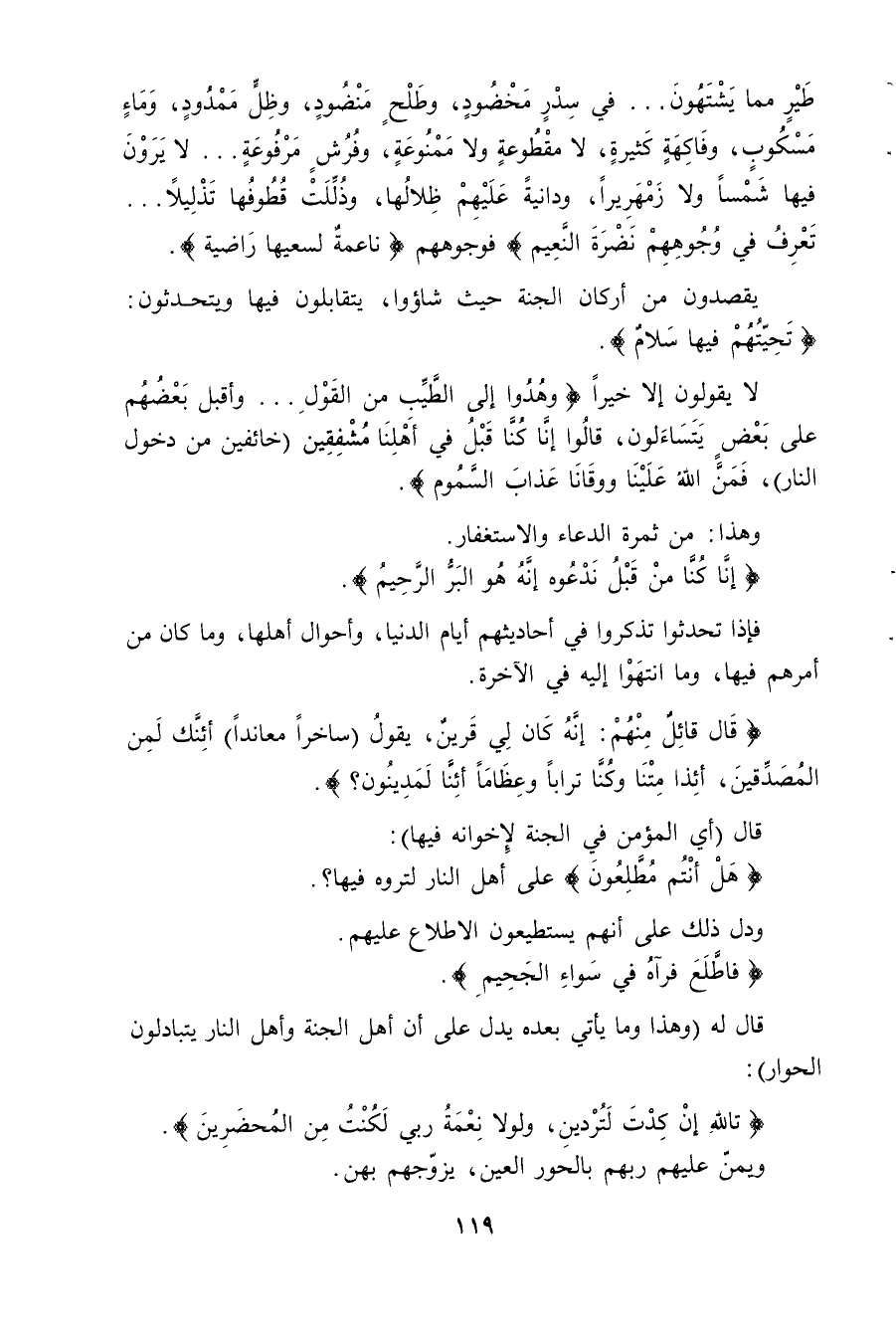 قال له (وهذا وما يأتي بعده يدل على أن أهل الجنة وأهل النار يتبادلون الحوار):