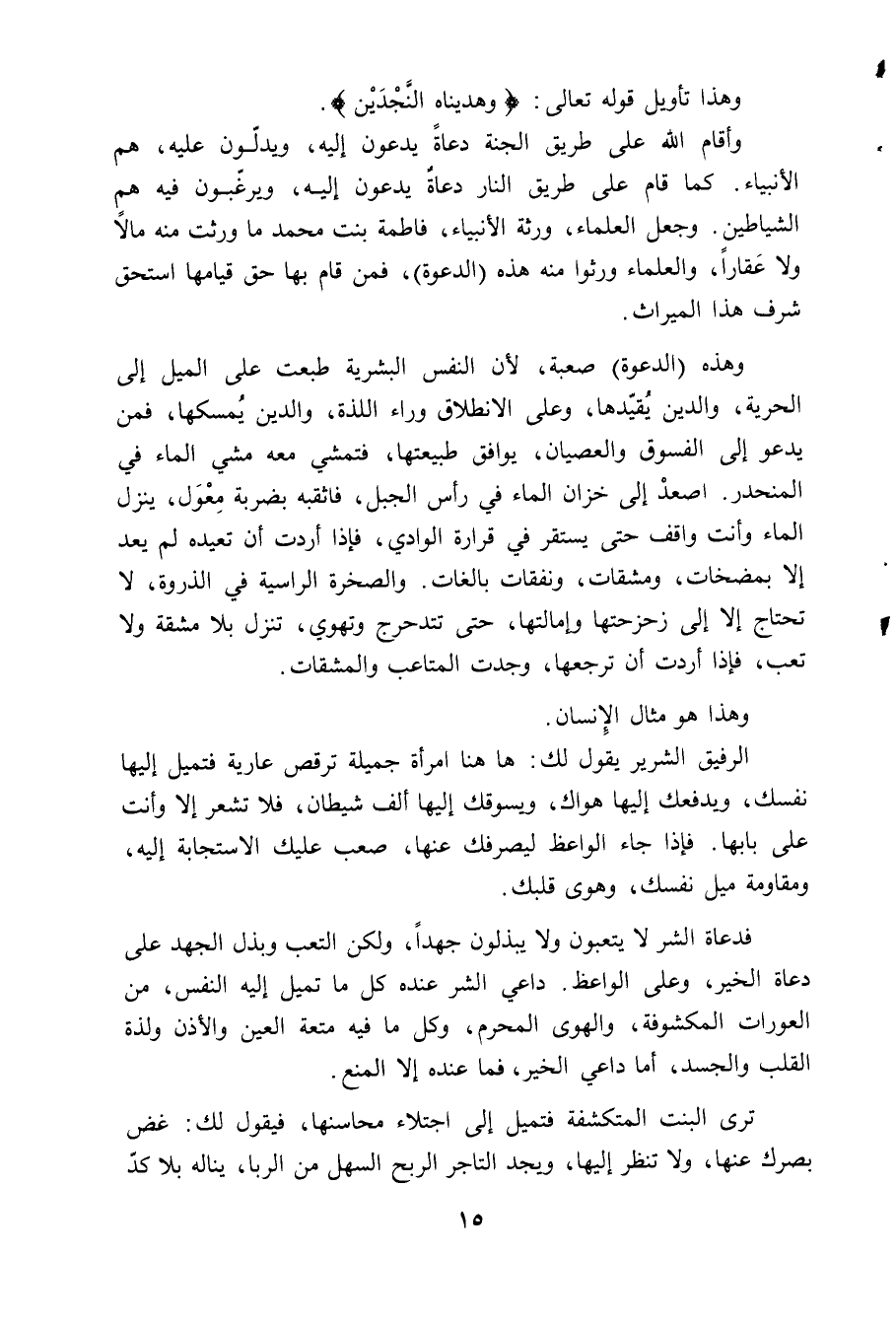 وهذه (الدعوة) صعبة، لأن النفس البشرية طبعت على الميل إلى الحرية، والدين يُقيدها، وعلى الانطلاق وراء اللذة، والدين يُمسكها، فمن يدعو إلى الفسوق والعصيان، يوافق طبيعتها فتمشي معه مشي الماء في المنحدر. اصعد إلى خزان الماء في رأس الجبل، فأثقبه بضربة معول، يَنْزل الماء وأنت واقف حتى يستقر في قرارة الوادي، فاذا أردت أن تعيده لم يعد الا بمضخات، ومشقات، ونفقات بالغات. والصخرة الراسية في الذروة، لا تحتاج الا إلى زحزحتها وامالتها، حتى تتدحرج وتهوي، تنزل بلا مشقة ولا تعب. فاذا أردت أن ترجعها، وجدت المتاعب والمشقات.