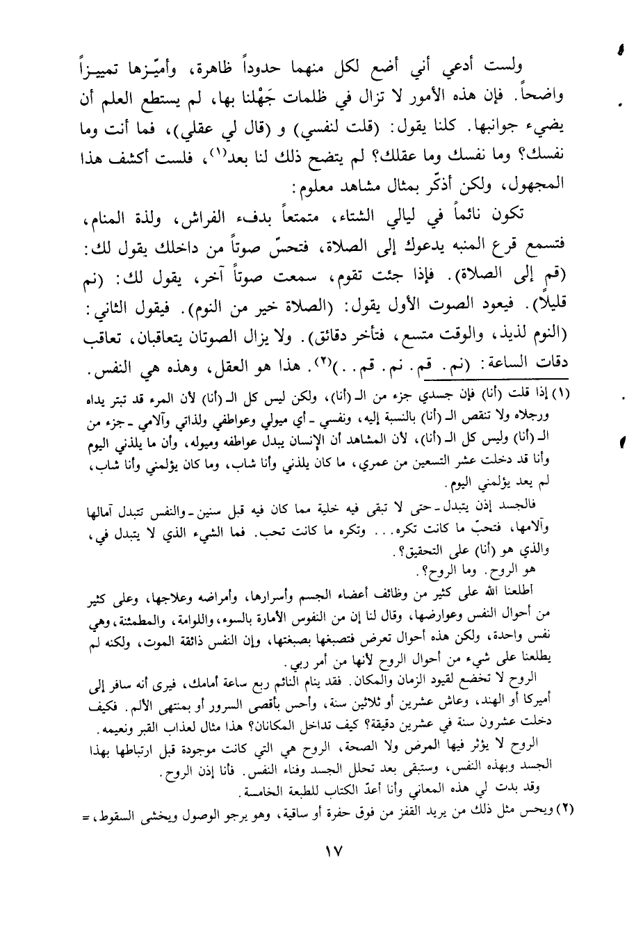 (¬1) اذا قلت (أنا) فان جسدي جزء من ال (انا) ولكن ليس كل ال (انا) لأن المرء قد تبتر يداه ورجلاه ولا تنقص ال (أنا) بالنسبة اليه ونفسي - أي ميولي وعواطفي - ولذاتي وآلامي، جزء من ال (انا) ولكن ليس كل ال (انا)، لأن المشاهد ان الانسان يبدل عواطفه وميوله، وان ما يلذني اليوم وأنا على عتبة السبعين، ما كان يلذني وأنا شاب وما كان يؤلمني وأنا شاب، لم يعد يؤلمني اليوم.