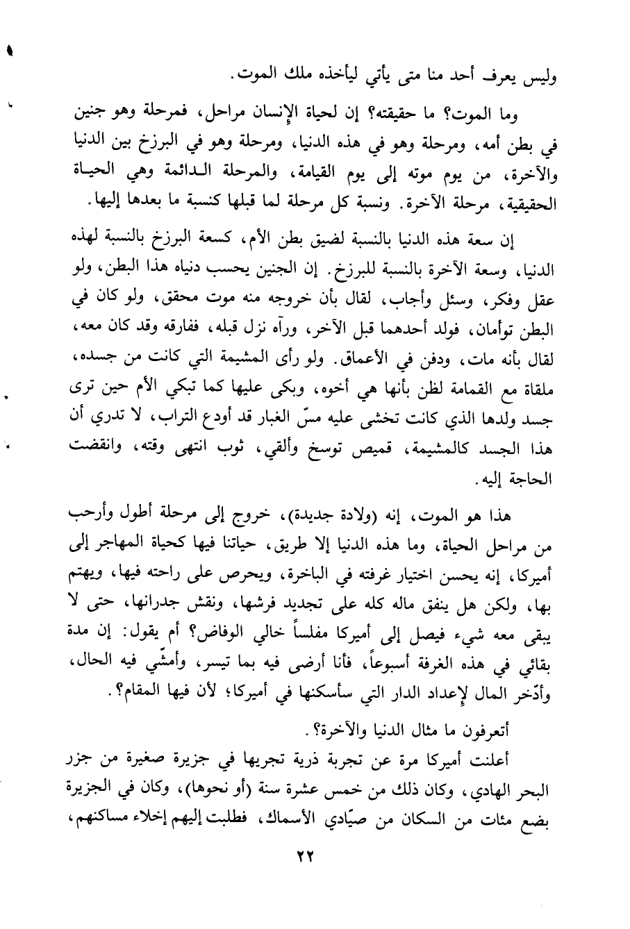 هذا هو الموت، انه (ولادة جديدة)، خروج إلى مرحلة أطول وأرحب من مراحل الحياة، وما هذه الدنيا الا طريق، حياتنا فيها كحياة المهاجر إلى اميركا، انه يحسن اختيار غرفته في الباخرة، ويحرص على راحته فيها، ويهتم بها، ولكن هل ينفق ماله كله على تجديد فرشها، ونقش جدرانها، حتى لا يبقى معه شيء فيصل إلى اميركا مفلسا خالي الوفاض؟ أم يقول: ان مدة بقائي في هذه الغرفة اسبوعا، فأنا أرضى فيه بما تيسر، وأمشّي فيه الحال وأدخر المال لاعداد الدار التي سأسكنها في اميركا. لأن فيها المقام؟