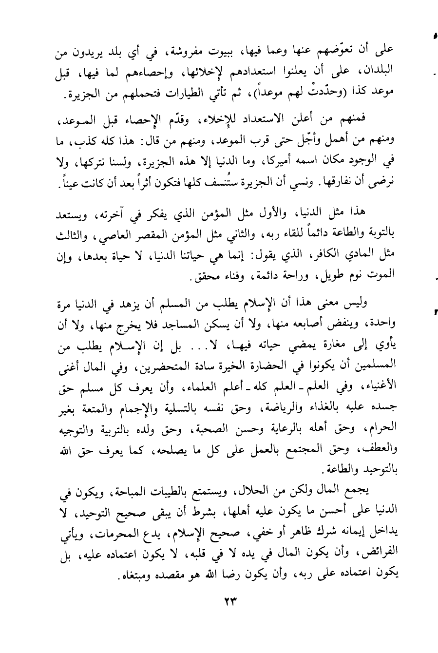 فمنهم من أعلن الاستعداد للاخلاء، وقدم الاحصاء قبل الموعد، ومنهم من أهمل وأجل حتى قرب الموعد، ومنهم من قال: هذا كله كذب. ما في الوجود مكان اسمه اميركا. وما الدنيا الا هذه الجزيرة. ولسنا نتركها، ولا نرضى أن نفارقها، ونسي أن الجزيرة ستنسف كلها فتكون أثرا بعد أن كانت عيناً.