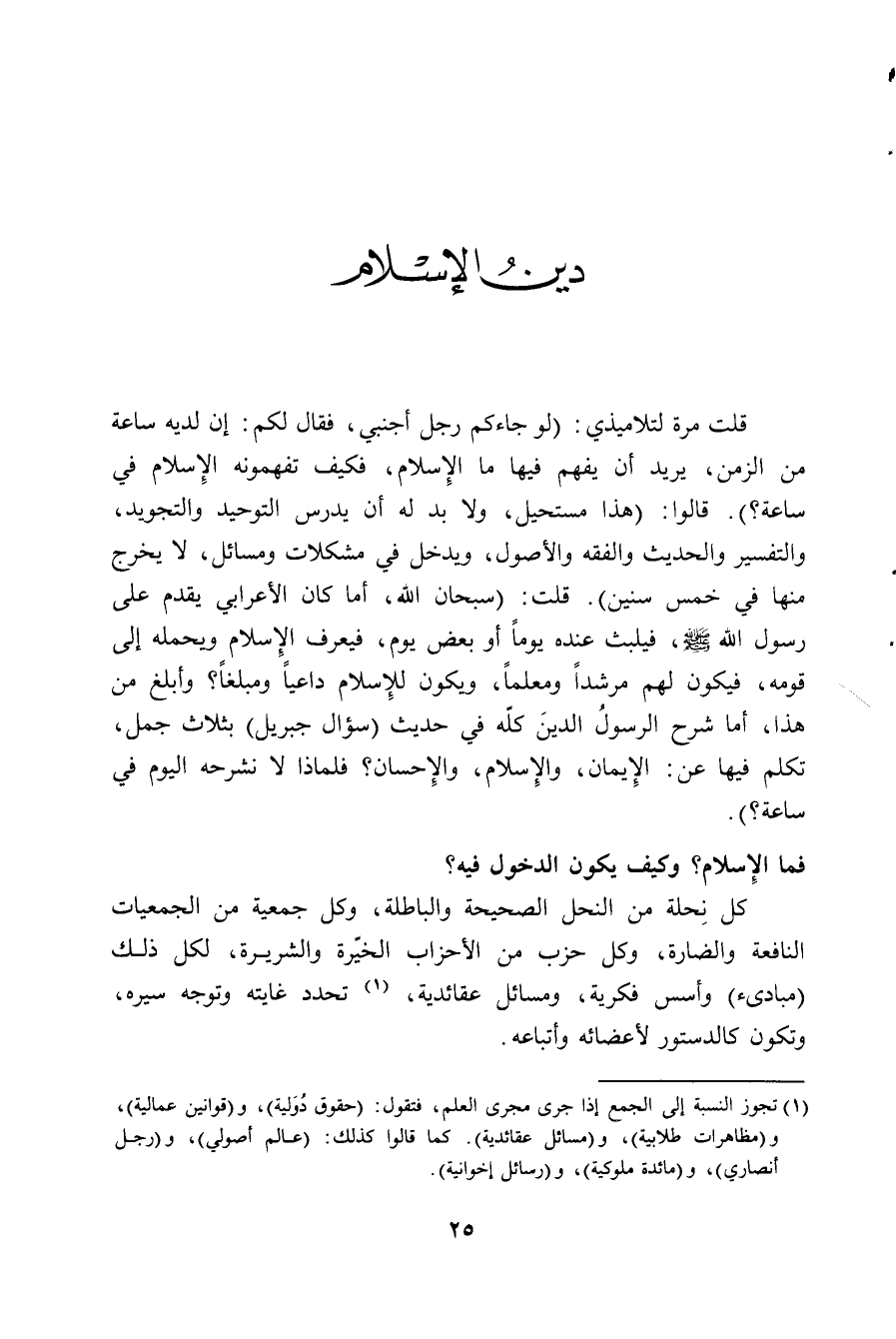 قلت مرة لتلاميذي: "لو جاءكم رجل أجنبي، فقال لكم: ان لديه ساعة من الزمن، يريد أن يفهم فيها ما الاسلام، فكيف تفهمونه الاسلام في ساعة". قالوا: "هذا مستحيل، ولا بد له أن يدرس الوحيد والتوجيد، والتفسير والحديث والفقه والأصول، ويدخل في مشاكل ومسائل، لا يخرج منها في خمس سنين". قلت: "سبحان الله أما كان الاعرابي يقدم على رسول الله صلى الله عليه وسلم، فيلبث عنده يوماً أو بعض يوم، فيعرف الاسلام ويحمله إلى قومه، فيكون لهم مرشداً ومعلماً، ويكون للاسلام داعياً ومبلغاً؟ وأبلغ من هذا، أما شرح الرسول الدين كله (في حديث سؤال جبريل) بثلاث جمل، تكلم فيها عن: الايمان والاسلام، والاحسان؟ فلماذا لا نشرحه اليوم في ساعة؟ .. ".