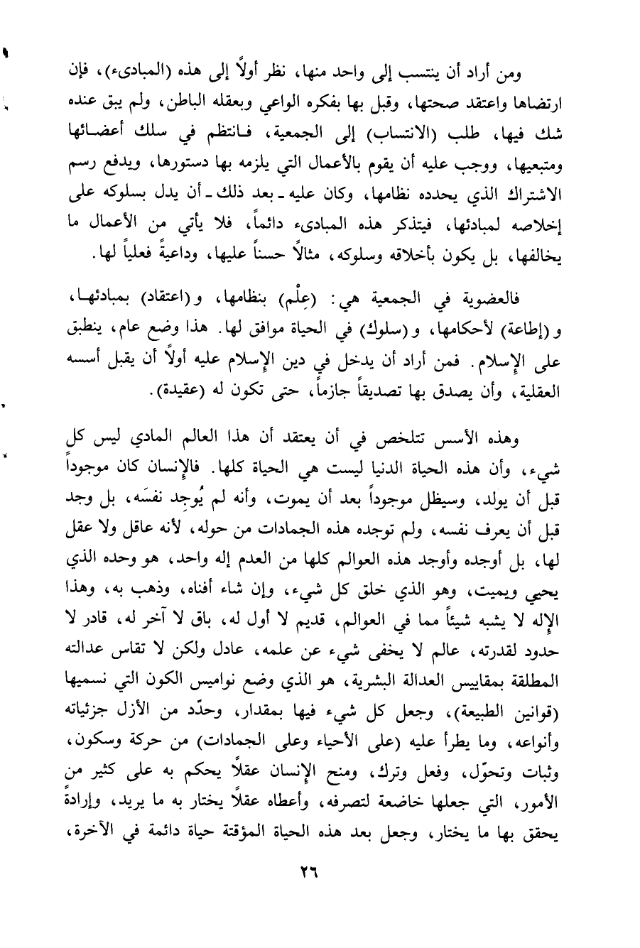 ومن أراد أن ينتسب إلى واحد منها، نظر أولا إلى هذه (المبادئ)، فان ارتضاها واعتقد صحتها، وقبل بها بفكره الواعي وبعقله الباطن، ولم يبق عنده شك فيها، طلب (الانتساب) إلى الجمعية. فانتظم في سلك أعضائها ومتبعيها، ووجب عليه أن يقوم بالأعمال التي يلزمه بها دستورها، ويدفع رسم الاشتراك الذي يحدده نظامها، وكان عليه (بعد ذلك) أن يدل بسلوكه على اخلاصه لمبادئها، فيتذكر هذه المبادئ دائماً، فلا يأتي من الأعمال ما يخالفها، بل يكون باخلاقه وسلوكه، مثالا حسنا عليها، وداعية فعليا لها.