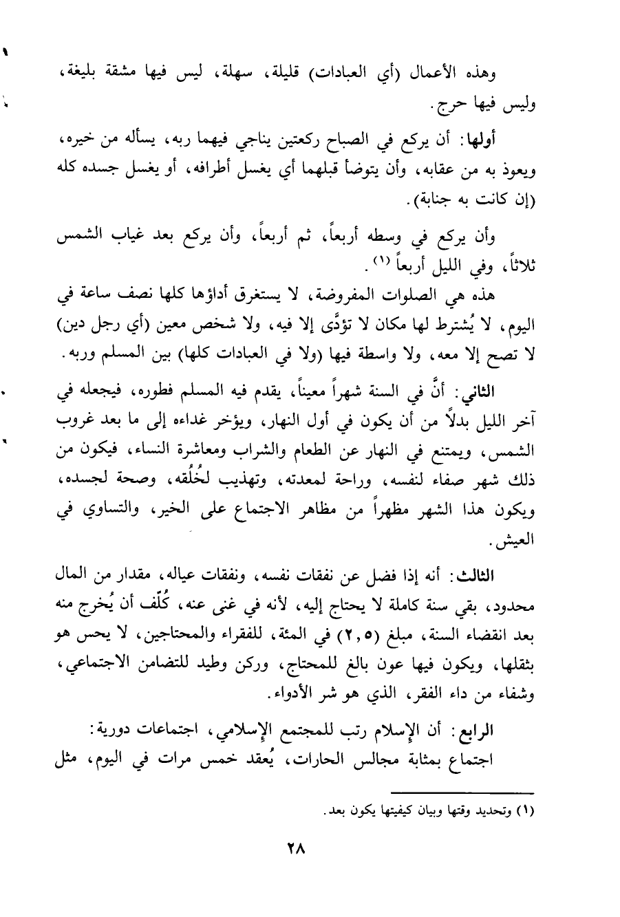 الثاني: ان في السنة شهرا معينا، يقدم فيه المسلم فطوره، فيجعله في آخر الليل بدلا من أن يكون في أول النهار، ويؤخر غداءه إلى ما بعد غروب الشمس، ويمتنع في النهار عن الطعام والشراب ومعاشرة النساء، فيكون من ذلك شهر صفاء لنفسه، وراحة لمعدته، وتهذيب لخُلقه، وصحة لجسده، ويكون هذا الشهر مظهرا من مظاهر الاجتماع على الخير، والتساوي في العيش.