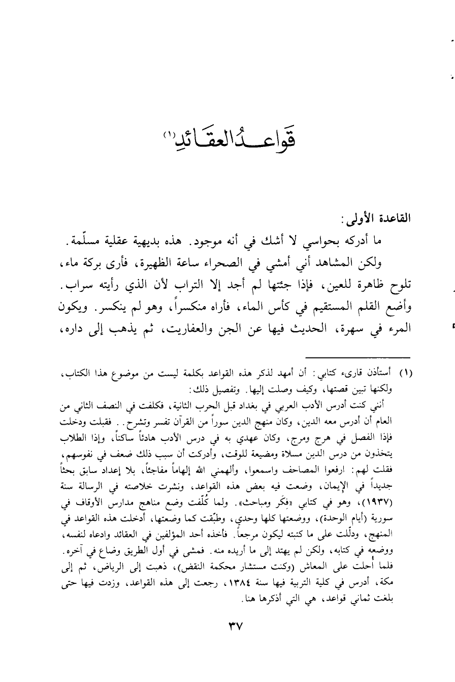 (¬1) استأذن قارئ كتابي: ان امهد لذكر هذه القواعد، بكلمة ليست من موضوع هذا الكتاب، ولكنها تبين قصتها، وكيف وصلت اليها. وتفصيل ذلك: أنني كنت أدرس الأدب العربي في بغداد قبل الحرب الثانية، فكلفت في النصف الثاني من العام أن أدرس معه الدين، وكان منهج الدين سورا من القرآن تفسر وتشرح .. فقبلت ودخلت فاذا الفصل في هرج ومرج، وكان عهدي به في درس الأدب، هادئا ساكنا، واذا الطلاب يتخذون من درس الدين مسلاة ومضيعة للوقت، وأدركت ان سبب ذلك ضعف الايمان في نفوسهم. فقلت لهم: ارفعوا المصاحف واسمعوا، والهمني الله الهاما مفاجئا، بلا اعداد سابق بحثا جديدا في الايمان، وضعت فيه بعض هذه القواعد، ونشرت خلاصته في الرسالة سنة (1937) أو سنة (1938)، وهو في كتابي: (فكر ومباحث). ولما كلفت وضع مناهج مدراس الأوقاف في سورية (أيام الوحدة)، ووضعتها كلها وحدي، وطبقت كما وضعتها، أدخلت هذه القواعد في المنهج، ودللت على ما كتبته ليكون مرجعا، فأخذه أحد المؤلفين في العقائد وادعاه لنفسه، ووضعه في كتابه، ولكن لم يهتد إلى ما أريده منه، فمشى في أول الطريق وضاع في آخره. فلما أحلت على المعاش (وكنت مستشار محكمة النقض)، وذهبت إلى الرياض، ثم إلى مكة، أدرس في كلية التربية فيها، رجعت إلى هذه القواعد، وزدت فيها حتى بلغت ثماني قواعد، هي التي أذكرها هنا.