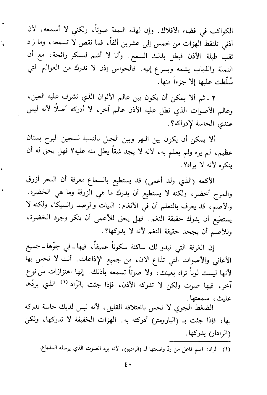 الكواكب في فضاء الأفلاك. وان لهذه النملة صوتا، ولكني لا أسمعه، لأن أذني تلتقط الهزات من خمس إلى عشرين الفا، فما نقص لا تسمعه، وما زاد ثقب طبلة الاذن فبطل بذلك السمع. وأنا لا أشم للسكر رائحة، مع أن النملة والذباب يشمه ويسرع اليه. فالحواس اذن لا تدرك من العوالم التي سلطت عليها الا جزءا منها.