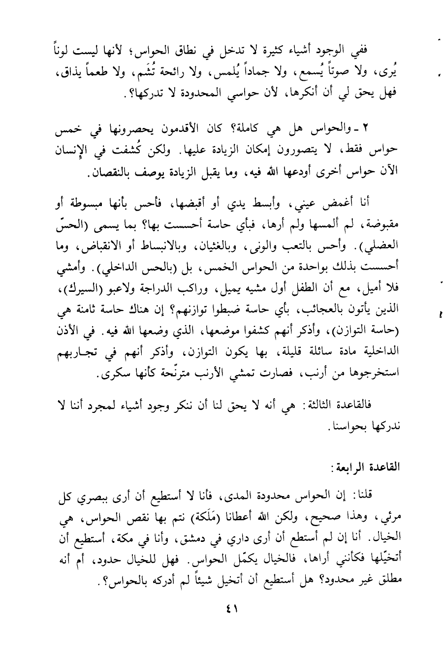 ففي الوجود أشياء كثيرة لا تدخل في نطاق الحواس، لأنها ليست لونا يرى، ولا صوتا يسمع، ولا جمادا يلمس، ولا رائحة تشم، ولا طعما يذاق، فهل يحق لي ان أنكرها، لأن حواسي المحدودة لا تدركها؟