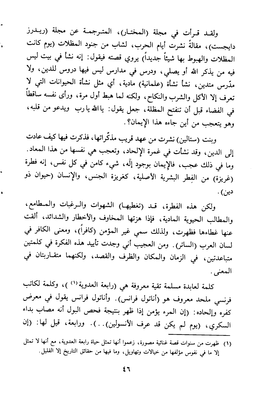 كلمة لعابدة مسلمة تقية معروفة هي (رابعة العدوية (¬1))، وكلمة لكاتب فرنسي ملحد معروف هو (اناتول فرانس). واناتول فرانس يقول في معرض كفره والحاده: "ان المرء يؤمن اذا ظهر بنتيجة فحص البول، انه مصاب بداء السكري، (يوم لم يكن قد عرف الانسولين) .. ". ورابعة، قيل لها: "ان