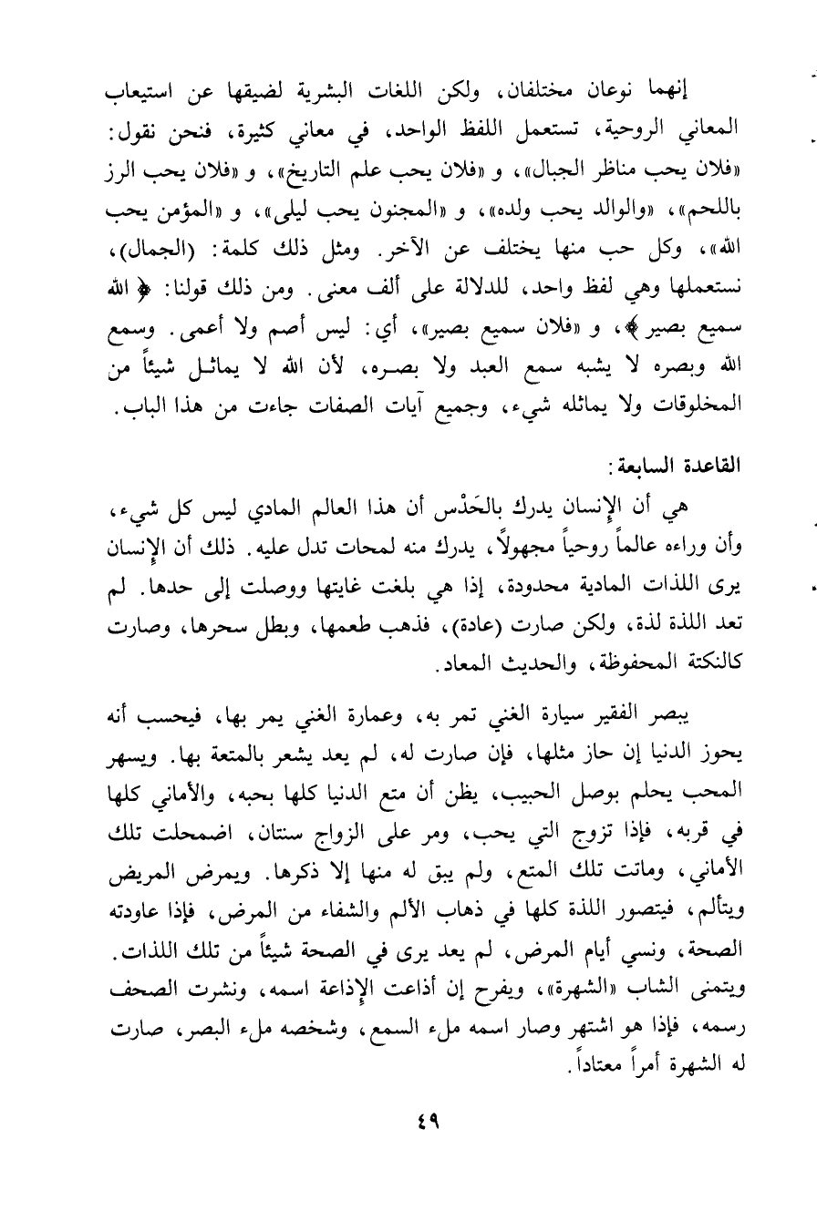هي ان الانسان يدرك بالحَدْس ان هذا العالم المادي ليس كل شيء، وان وراءه عالماً روحياً مجهولا، يدرك منه لمحات تدل عليه. ذلك ان الانسان يرى اللذات المادية محدودة، اذا هي بلغت غايتها ووصلت إلى حدها، لم تعد اللذة لذة، ولكن صارت (عادة)، فذهب طعمها، وبطل سحرها، وصارت كالنكتة المحفوظة، والحديث المعاد.