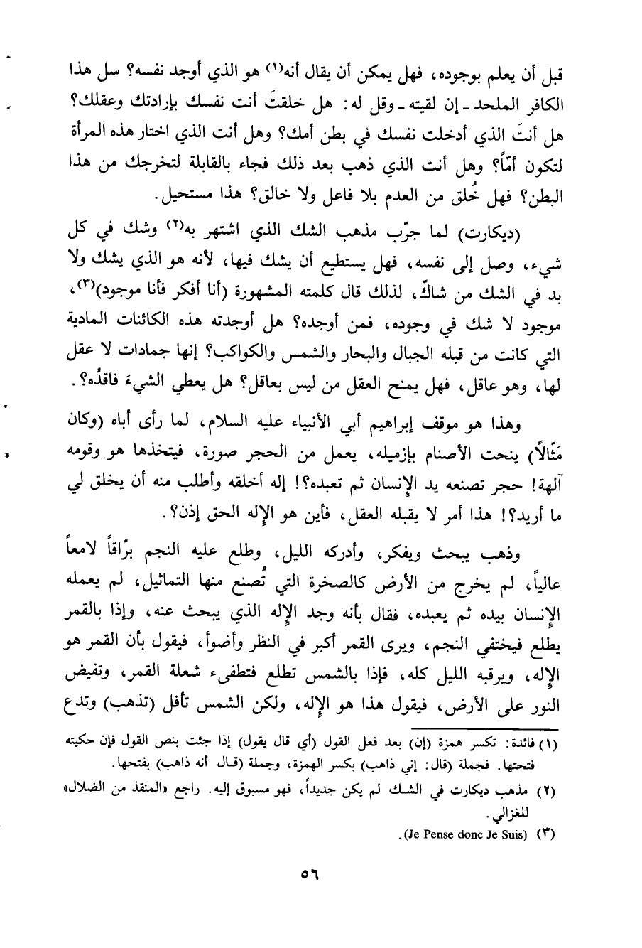 (¬1) مذهب ديكارت في الشك: لم يكن جديداً، فهو مسبوق اليه. راجع (المنقذ من الضلال) للغزالي.