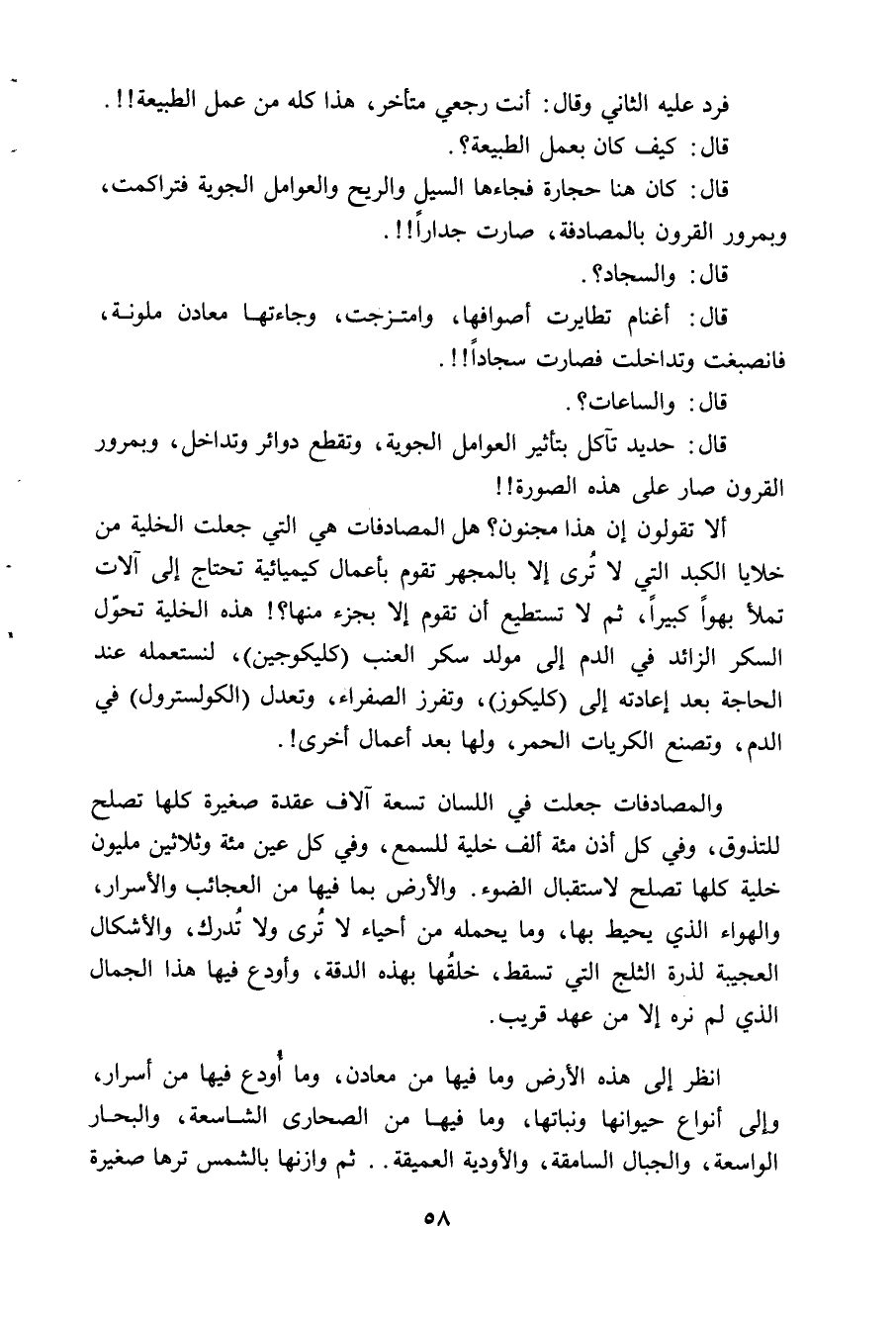 ألا تقولون ان هذا مجنون؟ هل المصادفات هي التي جعلت الخلية من خلايا الكبد التي لا ترى الا بالمجهر تقوم بأعمال كيميائية تحتاج إلى آلات تملأ بهواً كبيراً، ثم لا تستطيع أن تقوم الا بجزء منها؟! هذه الخلية تحول السكر الزائد في الدم إلى مولد سكر العنب (كليكوجين)، لنستعمله عند الحاجة بعد اعادته إلى (كليكوز)، وتفرز الصفراء، وتعدل (الكولسترول) في الدم، وتصنع الكريات الحمر، ولها بعد أعمال اخرى!