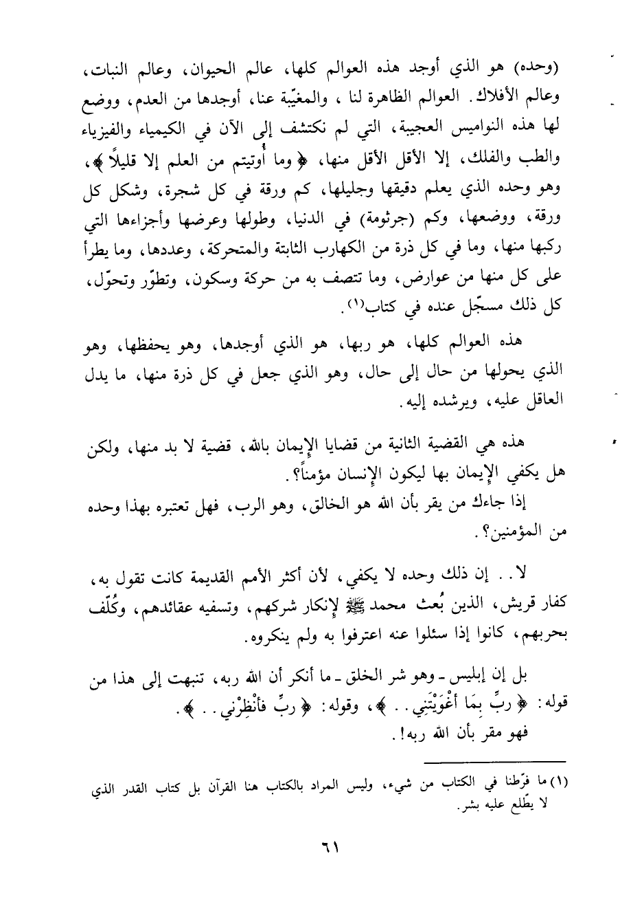 لا .. ان ذلك وحده لا يكفي، لأن أكثر الأمم القديمة كانت تقول له، كفار قريش، الذين بعث محمد صلى الله عليه وسلم لانكار شركهم، وتسفيه عقائدهم، وكلف بحربهم، كانوا اذا سئلوا عنه اعترفوا به ولم ينكروه.