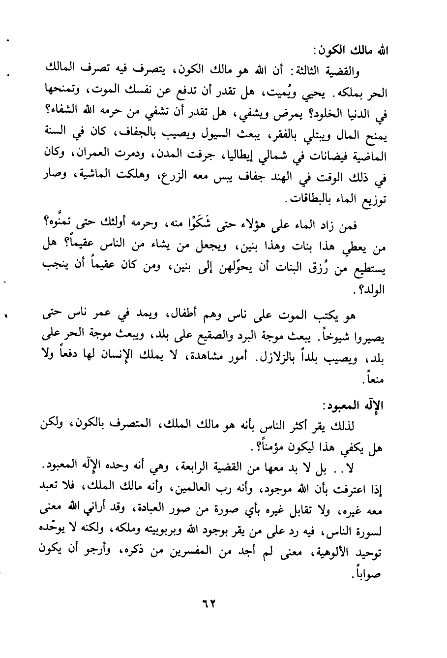 لا .. بل لا بد معها من القضية الرابعة، وهي انه وحده الاله المعبود. اذا اعترفت بأن الله موجود، وأنه رب العالمين، وأنه مالك الملك، فلا تعبد معه غيره، ولا تقابل غيره بأي صورة من صور العبادة. وقد أراني الله معنى لسورة الناس، فيه رد على من يقر بوجود الله وبربوبيته وملكه، ولكنه لا يوحده توحيد الالوهية، معنى لم أجد من المفسرين من ذكره، وأرجو أن يكون صوابا.