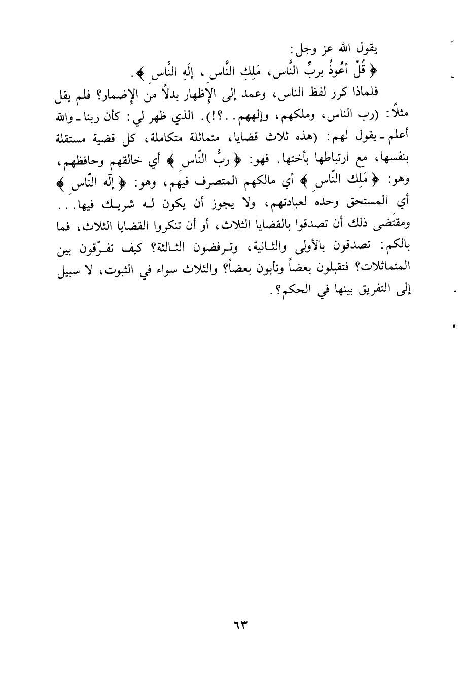 فلماذا كرر لفظ الناس؟ وعمد إلى الاظهار بدلا من الاضمار؟! فلم يقل مثلا: "رب الناس، وملكهم، والههم .. ؟! ". الذي ظهر لي، كأن ربنا (والله أعلم) يقول لهم: "هذه ثلاث قضايا، متماثلة متكاملة، كل قضية مستقلة بنفسها، مع ارتباطها باختها. فهو: (رب الناس) أي خالقهم وحافظهم، وهو: (ملك الناس) أي مالكهم المتصرف فيهم. وهو (اله الناس) أي المستحق وحده لعبادتهم، لا يجوز أن يكون له شريك فيها .. ". ومقتضى ذلك أن تصدقوا بالقضايا الثلاث، أو أن تنكروا القضايا الثلاث، فما بالكم: تصدقون بالاولى والثانية، وترفضون الثالثة؟ كيف تفرقون بين المتماثلات؟ فتقبلون بعضا وتأبون بعضا؟ والثلاث سواء في الثبوت، لا سبيل إلى التفريق بينها في الحكم؟.