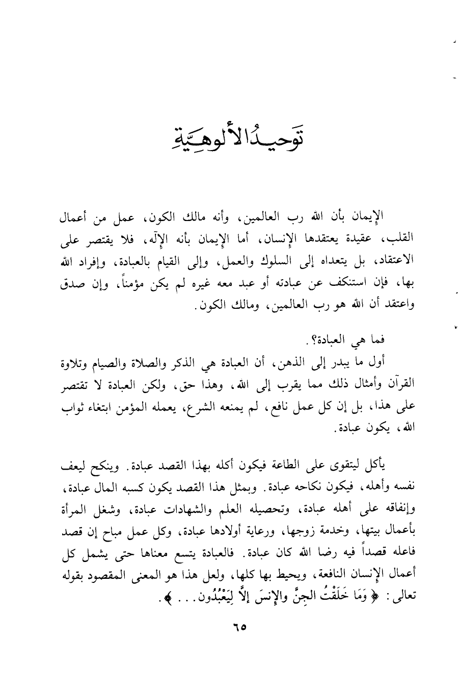 يأكل ليتقوى على الطاعة فيكون أكله بهذا القصد عبادة، وينكح ليعف نفسه وأهله، فيكون نكاحه عبادة، وبمثل هذا القصد يكون كسبه المال عبادة، وانفاقه على أهله عبادة، وتحصيله العلم والشهادات عبادة، وشغل المرأة بأعمال بيتها، وخدمة زوجها، ورعاية أولادها عبادة، وكل عمل مباح ان قصد فاعله قصدا فيه رضا الله كان عبادة، فالعبادة يتسع معناها حتى يشمل كل أعمال الانسان النافعة، ويحيط بها كلها. ولعل هذا هو المعنى المقصود بقوله تعالى: