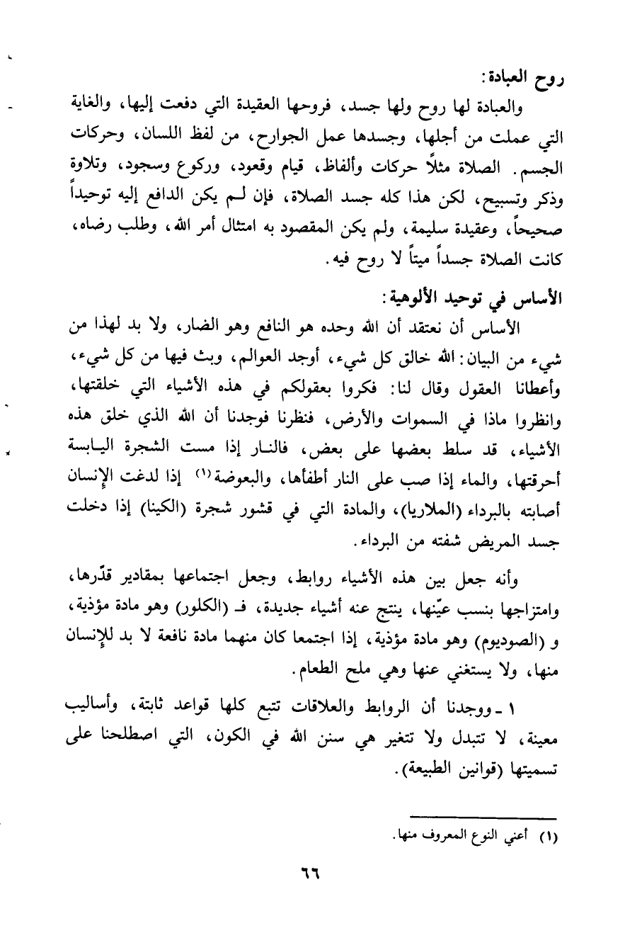 الأساس أن نعتقد ان الله وحده هو النافع وهو الضار، ولا بد لهذا من شيء من البيان: الله خالق كل شيء، أوجد العوالم، وبث فيها من كل شيء. وأعطانا العقول وقال لنا: فكروا بعقولكم في هذه الأشياء التي خلقتها، وانظروا ماذا في السموات والأرض، فنظرنا فوجدنا ان الله الذي خلق هذه الأشياء، قد سلط بعضها على بعض، فالنار اذا مست الشجرة اليابسة أحرقتها، والماء اذا صب على النار أطفأها، والبعوضة (¬1) اذا لدعت الانسان أصابته بالبرداء (الملاريا)، والمادة التي في قشور شجرة (الكينا) اذا دخلت جسد المريض شفته من البرداء.