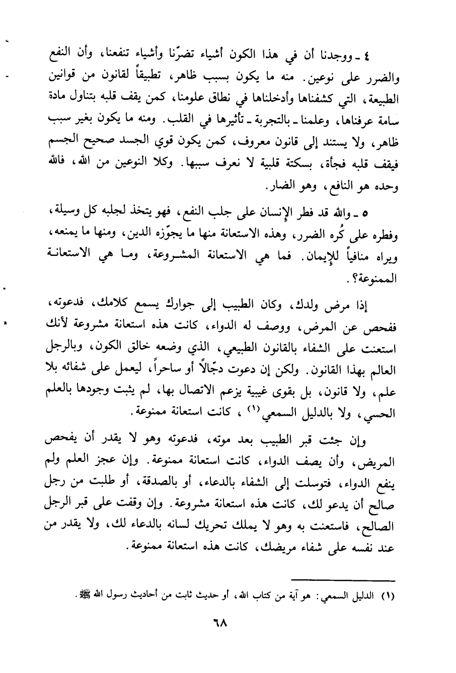 اذا مرض ولدك، وكان الطبيب إلى جوارك يسمع كلامك (فدعوته)، ففحص عن المرض، ووصف له الدواء، كانت هذه استعانة مشروعة، لأنك استعنت على الشفاء بالقانون الطبيعي، الذي وضعه خالق الكون، وبالرجل العالم بهذا القانون. ولكن ان دعوت دجالا أو ساحراً، ليعمل على شفائه بلا علم، ولا قانون، بل بقوى غيبية يزعم الاتصال بها، لم يثبت وجودها بالعلم الحسي، ولا بالدليل السمعي (¬1) كانت استعانة ممنوعة.