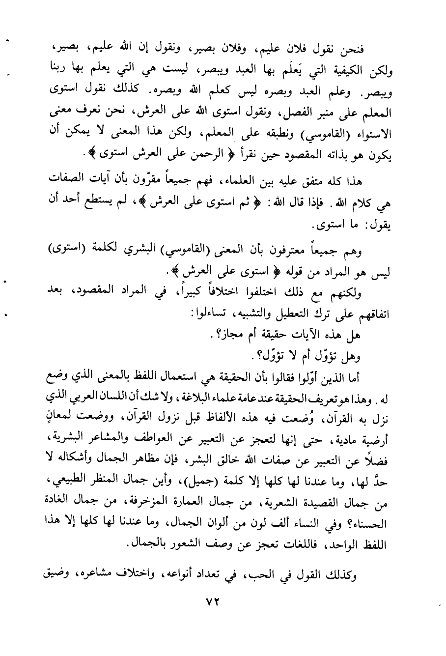 أما الذين أوّلوا فقالوا بأن الحقيقة هي استعمال اللفظ بالمعنى الذي وضع له. وهذا هو تعريف الحقيقة عند عامة علماء البلاغة. ولا شك ان اللسان العربي الذي نزل به القرآن. وضعت فيه هذه الألفاظ قبل نزول القرآن. ووضعت لمعانٍ أرضية مادية، حتى انها لتعجز عن العبير عن العواطف والمشاعر البشرية. فضلا عن التعبير عن صفات الله خالق البشر، فان مظاهر الجمال وأشكاله لا حدّ لها، وما عندنا لها كلها الا كلمة (جميل) وأين جمال المنظر الطبيعي، من جمال القصيدة الشعرية، من جمال العمارة المزخرفة من جمال الغادة الحسناء؟ وفي النساء ألف لون من ألوان الجمال، وما عندنا لها كلها الا هذا اللفظ الواحد، فاللغات تعجز عن وصف الشعور بالجمال وكذلك القول في الحب، في تعداد أنواعه. واختلاف مشاعره. وضيق