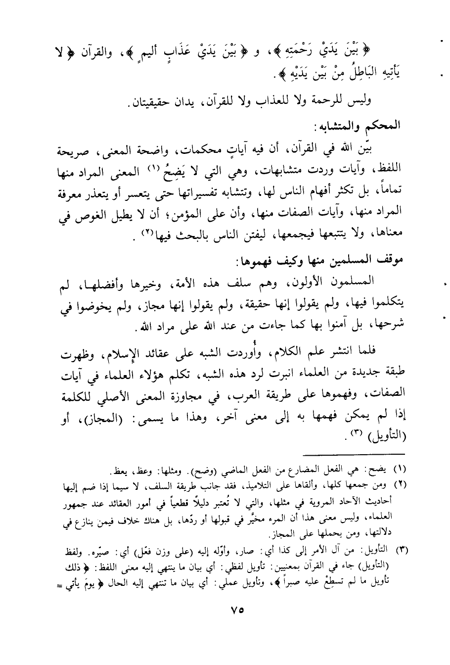 بين الله في القرآن، ان فيه آيات محكمات، واضحة المعنى، صريحة اللفظ، وآيات وردت متشابهات، وهي التي لا يضح (¬1) المعنى المراد منها تماما بل تكثر افهام الناس لها، وتتشابه تفسيراتها حتى يتعسر أو يتعذر معرفة المراد منها، وآيات الصفات منها، وان على المؤمن، الا يطيل الغوص في معناها، ولا يتتبعها فيجمعها، ليفتن الناس بالبحث فيها (¬2).
