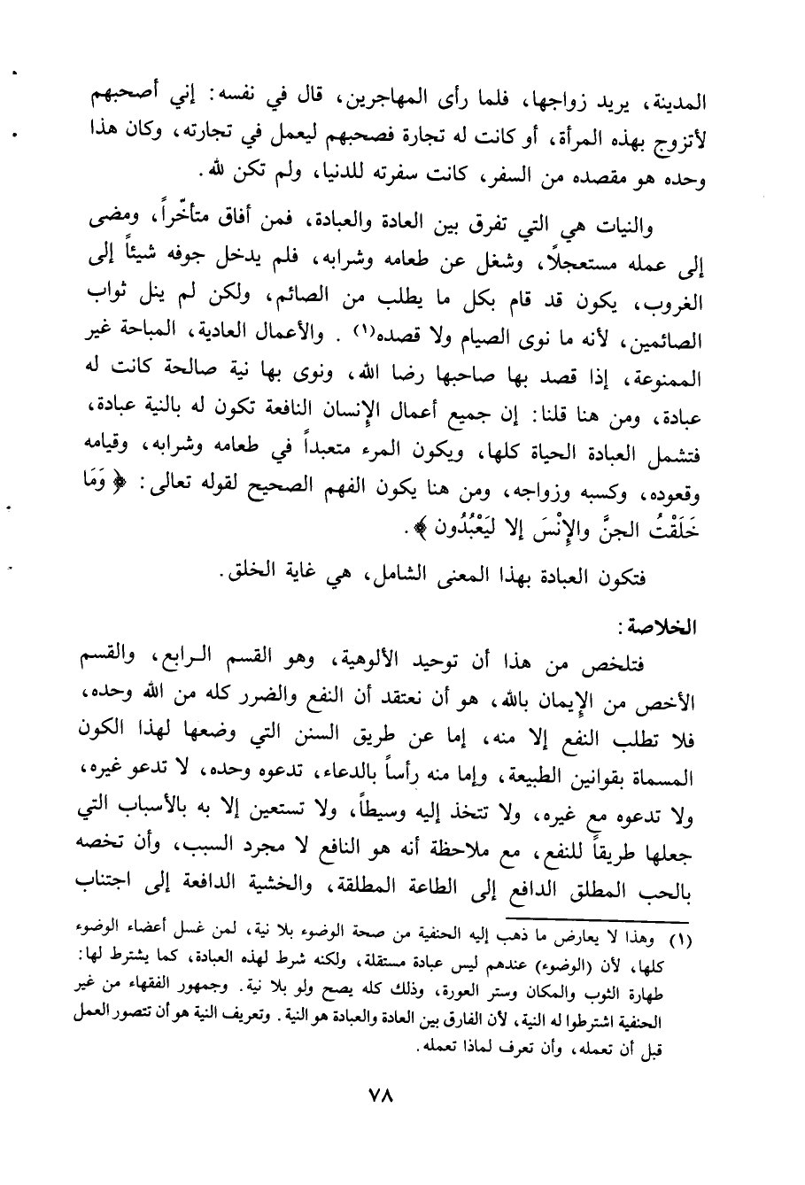 فتلخص من ذلك أن توحيد الالوهية - وهو القسم الرابع والقسم الاخص من الايمان بالله هو أن نعتقد ان النفع والضرر كله من الله وحده، فلا تطلب النفع الا منه، اما عن طريق السنن التي وضعها لهذا الكون المسماة بقوانين الطبيعة، واما منه رأسا بالدعاء، تدعوه وحده، لا تدعو غيره، ولا تدعوه مع غيره، ولا تتخذ اليه وسيطا، ولا تستعين الا به أو بالأسباب التي جعلها طريقا للنفع، مع ملاحظة أنه هوالنافع لا مجرد السبب، وأن تخصه بالحب المطلق الدافع إلى الطاعة المطلقة، والخشية الدافعة إلى اجتناب
