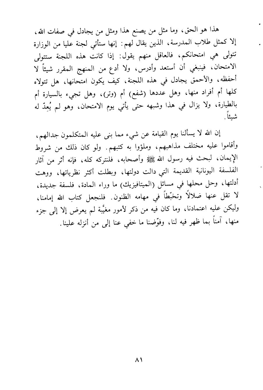 هذا هو الحق، وما مثل من يصنع هذا ومثل من يجادل في صفات الله، الا كمثل طلاب المدرسة، الذين يقال لهم: انها ستأتي لجنة عليا من الوزارة تتولى هي امتحانكم، فالعاقل منهم يقول: اذا كانت هذه اللجنة ستتولى الامتحان، فينبغي أن أستعد وأدرس، ولا أدع من المنهج المقرر شيئا لا أحفظه، والأحمق يجادل في هذه اللجنة، كيف يكون امتحانها، هل تتولاه كلها أم أفراد منها. وهل عددها (شفع) أم (وتر)، وهل تجيء بالسيارة أم بالطيارة، ولا يزال في هذا وشبهه حتى يأتي يوم الامتحان، وهو لم يعد له شيئا.