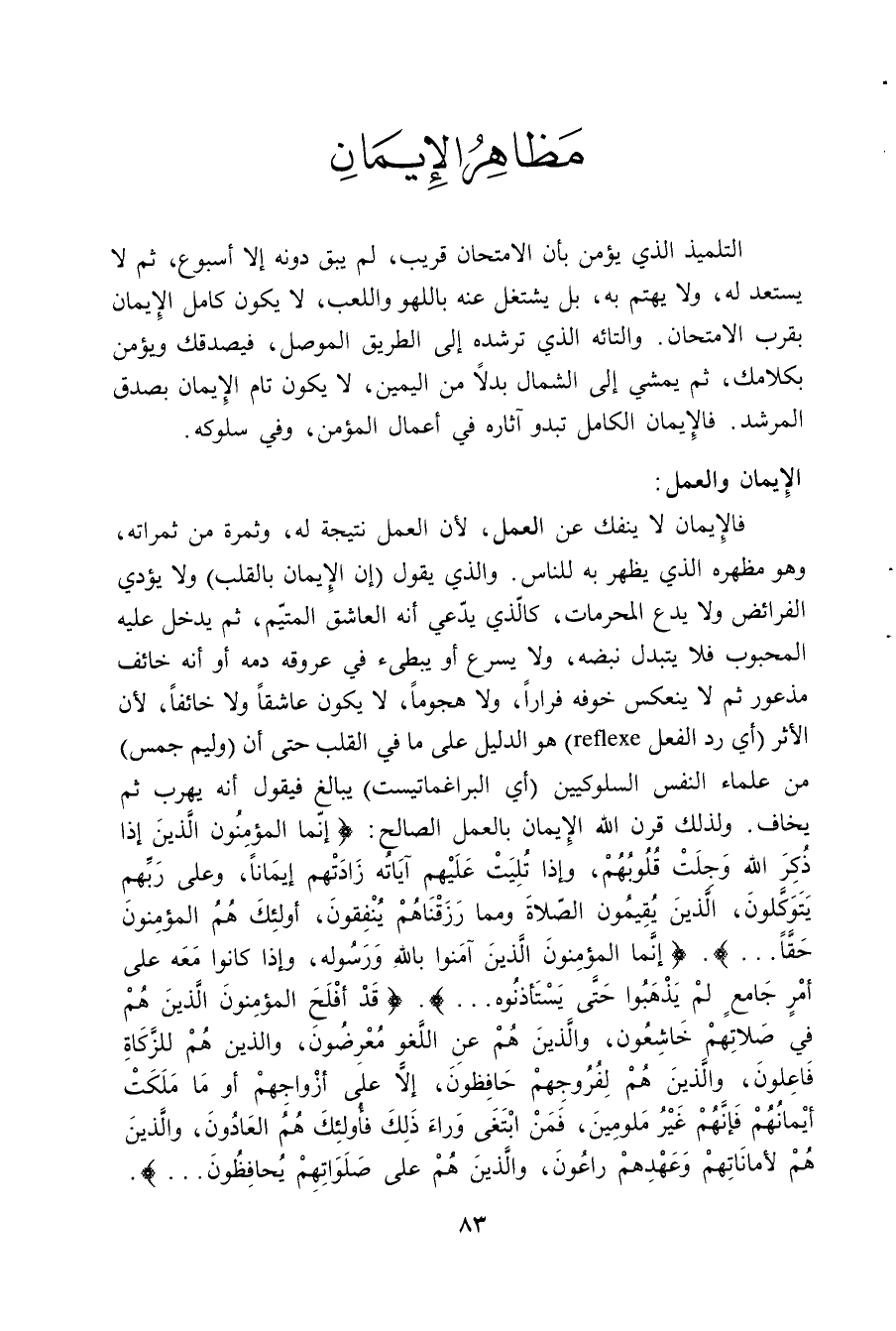 التلميذ الذي يؤمن بأن الامتحان قريب، لم يبق دونه الا اسبوع، ثم لا يستعد له، ولا يهتم به، بل يشتغل عنه باللهو واللعب، لا يكون كامل الايمان بقرب الامتحان. والتائه الذي ترشده إلى الطريق الموصل، فيصدقك ويؤمن بكلامك، ثم يمشي إلى الشمال بدلا من اليمين، لا يكون تام الايمان بصدق المرشد. فالايمان الكامل تبدو آثاره في أعمال المؤمن، وفي سلوكه.