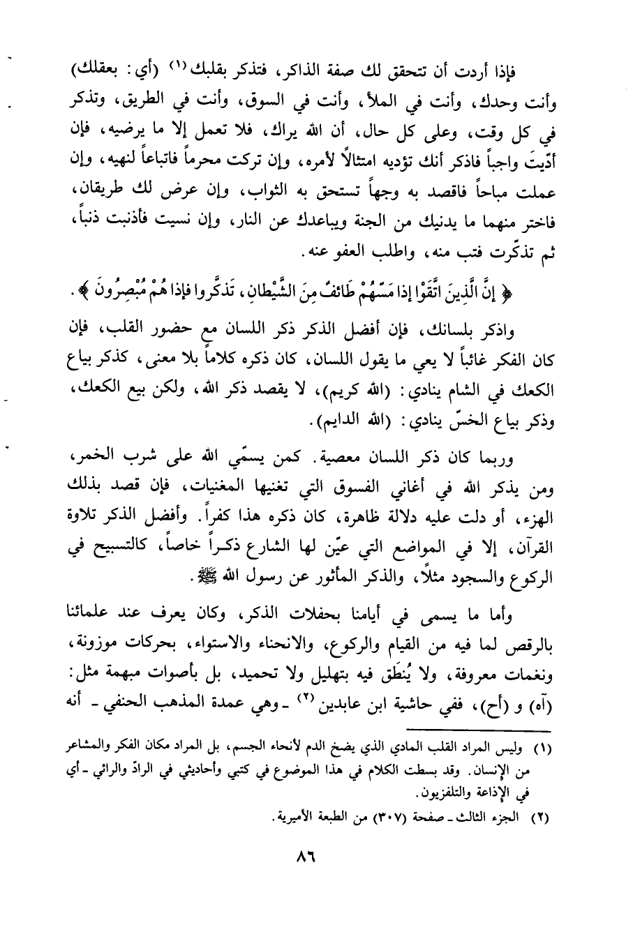 وأما ما يسمى في أيامنا بحفلات الذكر، وكان يعرف عند علمائنا بالرقص لما فيه من القيام والركوع، والانحناء والاستواء، بحركات موزونة، ونغمات معروفة، ولا ينطق فيه بتهليل ولا تحميد، بل بأصوات مبهمة مثل: (آه) و (أح)، ففي حاشية ابن عابدين (¬2) (وهي عمدة المذهب الحنفي) أنه