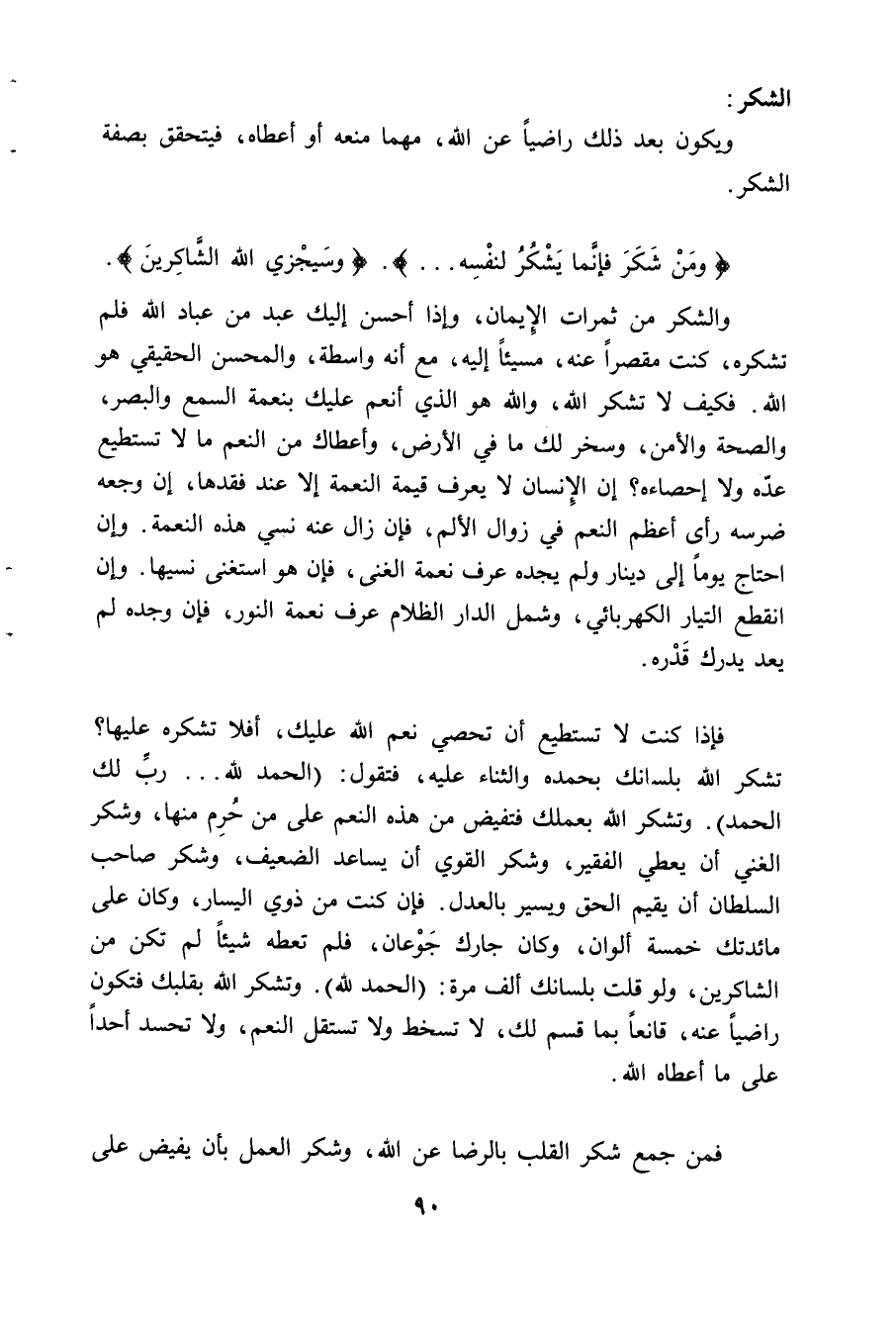 فاذا كنت لا تستطيع أن تحصي نعم الله عليك، أفلا تشكره عليها؟ تشكر الله بلسانك بحمده والثناء عليه، فتقول: "الحمد لله ... رب لك الحمد"، وتشكر الله بعملك فتفيض من هذه النعم على من حرم منها، وشكر الغني أن يعطي الفقير، وشكر القوي أن يساعد الضعيف، وشكر صاحب السلطان أن يقيم الحق، ويسير بالعدل. فان كنت من ذوي اليسار، وكان على مائدتك خمسة ألوان، وكان جارك جوعان، فلم تعطه شيئا لم تكن من الشاكرين. ولو قلت بلسانك ألف مرة: (الحمد لله). وتشكر الله بقلبك فتكون راضيا عنه، فانعا بما قسم لك، لا تسخط ولا تستقل النعم، ولا تحسد أحداً على ما أعطاه الله.