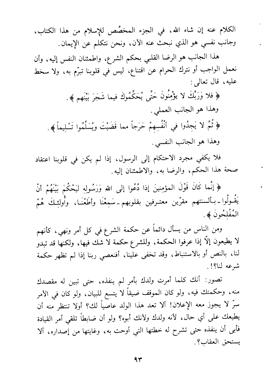 هذا الجانب هو الرضا القلبي بحكم الشرع، واطمئنان النفس اليه، وأن نعمل الواجب أو نترك الحرام عن اقتناع، ليس في قلوبنا تبرم به، ولا سخط عليه، قال تعالى: {فلا وربك لا يؤمنون حتى يحكموك فيما شجر بينهم}.