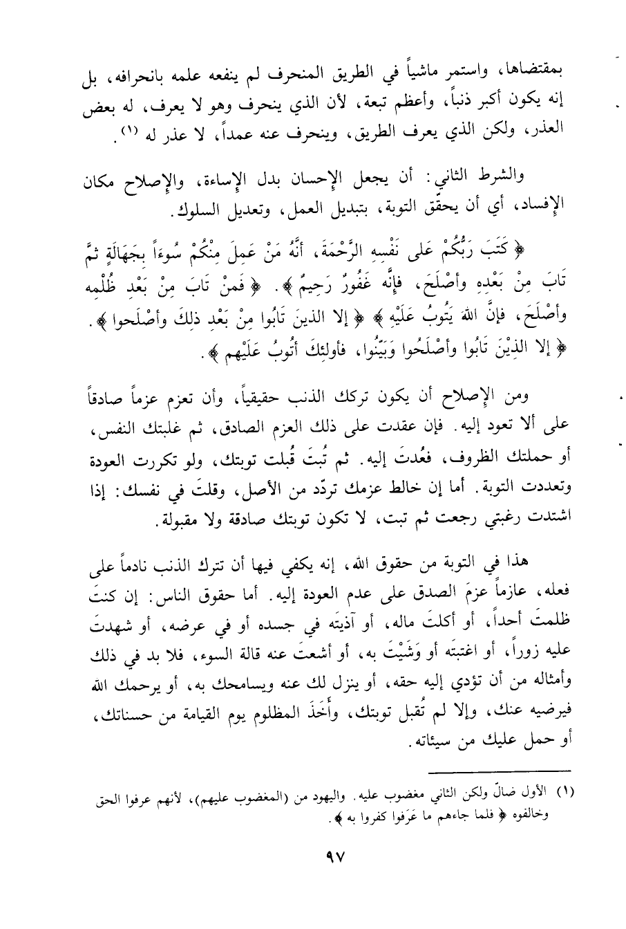 {كتب ربكم على نفسه الرحمة أنه من عمل منكم سوءاً بجهالة ثم تاب من بعده وأصلح فأنه غفور رحيم ... فمن تاب من بعد ظلمه وأصلح فإن الله يتوب عليه ... الا الذين تابوا من بعد ذلك وأصلحوا ... إلا الذين تابوا وأصلحوا وبينوا فأولئك أتوب عليهم ... }. ومن الاصلاح أن يكون ترك الذنب حقيقيا، وأن تعزم عزما صادقا على الاّ تعود اليه. فان عقدت على ذلك العزم الصادق، ثم غلبتك النفس، أو حملتك الظروف، فعدت اليه، ثم تبت قبلت توبتك، ولو تكررت العودة وتعددت التوبة. أما ان خالط عزمك تردد من الأصل، وقلت في نفسك، اذا اشتدت رغبتي رجعت ثم تبت لا تكون توبتك صادقة ولا مقبولة.