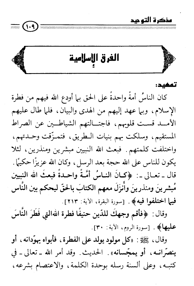 ومع ذلك دبّ الخلاف بين الناس، فما من أمة من الأمم إلا وقد اختلفت بهم الأهواء حتى وضع كل لنفسه أصولا عليها يبني مذهبه، وإليها يرجع في خصومته، فتناقضت مذاهبهم، وصار كل واحد حربا على أخيه، وشغل بذلك عن كتاب الله، وهدي رسوله، عليه الصلاة والسلام، إلا أنه- سبحانه- جرت سنته، واقتضت حكمته، أن يقيّض للحق في كل عصر جماعة تقوم عليه، وتهدي الناس إليه، إنجازًا للوعد بحفظ دينه، وإقامة للحجة، وإسقاطًا للمعاذير، قال- تعالى-: {وَإِنْ مِنْ أُمَّةٍ إِلَّا خَلَا فِيهَا نَذِيرٌ} [فاطر: 24] وقال: {إِنَّا نَحْنُ نَزَّلْنَا الذِّكْرَ وَإِنَّا لَهُ لَحَافِظُونَ} [الحجر: 9] وقال، صلى الله عليه وسلم: «افترقت اليهود على إحدى وسبعين فرقة كلها في النار إلا واحدة، وافترقت النصارى على اثنتين وسبعين فرقة كلها في النار إلا واحدة، وستفترق هذه الأمة على ثلاث وسبعين فرقة كلها في النار إلا واحدة» . وفي رواية، «قالوا: يا رسول الله! من الفرقة الناجية؟ قال: " من كان على مثل ما أنا عليه اليوم وأصحابي ".» وفي رواية، قال: «هي الجماعة يد الله على