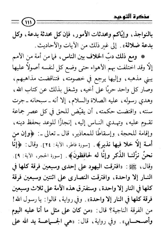 شعارها إجمالًا، ولسنا بمكلّفين بتعيينها، وتحديدها، ولا نحن في ضرورة إلى ذلك في عقيدة، أو عبادة، أو معاملة، أو دعوة إلى الحق، بل يكفينا في جميع شئوننا أن يتميز لدينا الحق من الباطل بالحجة والبرهان، وبالحق يعرف رجاله والدعاة إليه، فلا يعيب الشريعة إن خلت من ذلك، ولا ينقص قدر العلماء أن يضربوا صفحًا عن استقصاء الفرق الضالة حتى يبلغوا بها ما ذكر في الحديث من العدد، ومع ذلك، فقد حمل بعض العلماء حب الاستطلاع، والولع، والبحث أن يصنّفوا في تعيين الفرق، ويذكروا لكل فرقة ما به تتميز عن الأخرى إشباعًا للرغبة، واستجابة لداعي الفكر، وحاولوا أن يبلغوا بما جمعوا وقسّموا، وأصلوا وفصّلوا ما ذكر رسول الله، صلى الله عليه وسلم، في الحديث من غير أن يتجاوزوه أو يقفوا دونه.