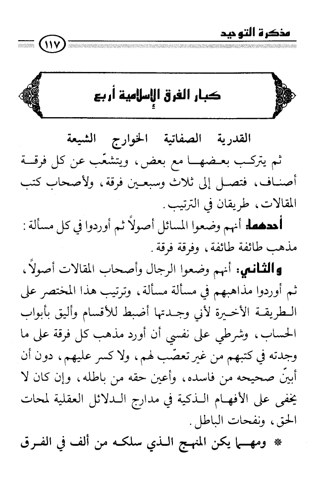 صناعة التأليف. لذلك اكتفيت بذكر أصول الفرق الكبار مع مراعاة ترتيبها حسب حدوثها من غير استقصاء، أو محاولة بلوغ العدد المذكور في الحديث.
