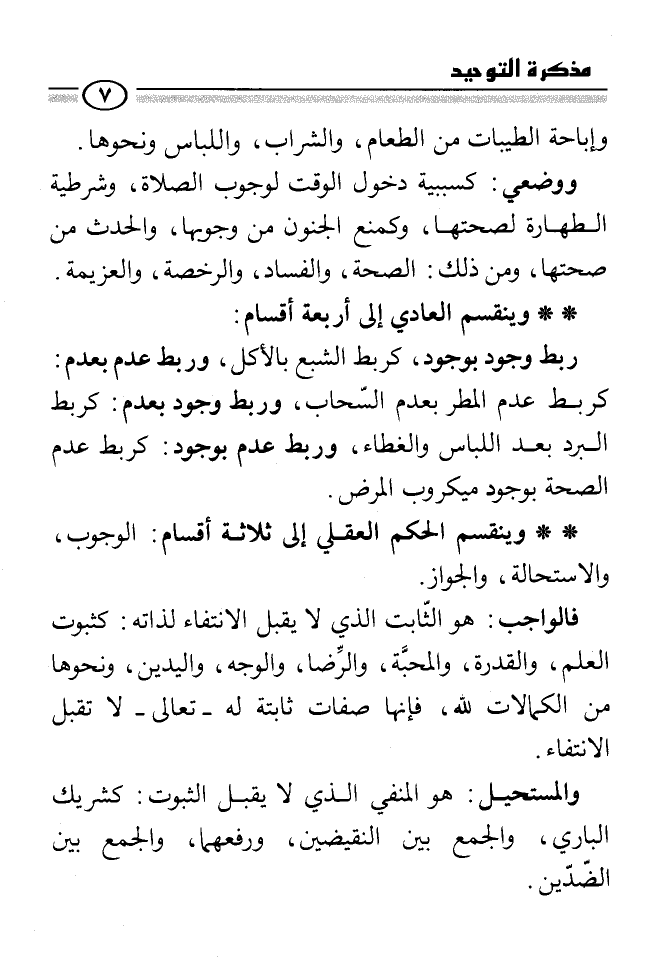 فقولنا: الله عليم وحكيم، والنقيضان لا يجتمعان ولا يرتفعان، والضدان لا يجتمعان، قضايا لا تختلف أحكامها كما تختلف الأحكام العادية إكرامًا من الله لأوليائه، أو إثباتًا لرسالة رسله، وكما تختلف الأحكام الشرعية الفرعية بنسخ أو استثناء، وليس المراد أنها تثبت بالعقل دون نصوص الشرع، فإن نصوص الشرع قد جاءت بأصول الدين، وكشفت للعقل عما خفي عليه، وقصر عن إدراكه من تفاصيل عقائد التوحيد، وسلكت به طريق الحق، وهدته إلى سواء السبيل.