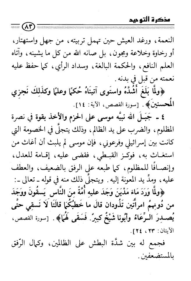 وقد ثبت أنه أتم أبعد الأجلين. فهذه سلسلة من حياة موسى قبل الرسالة، تضمنت شيئًا مما حباه الله به من العلم، والحكمة، والمروءة، والنجدة، ونصرة المظلوم، والأخذ على يد الظالم، والعطف على الضعيف، وقوة الإيمان بالله، والصدق في الالتجاء إليه، والتوكل عليه، والتواضع مع عزة النفس، وغير ذلك من مكارم الأخلاق التي يعد بها الله من يختاره للرسالة، وقيادة الأمم.