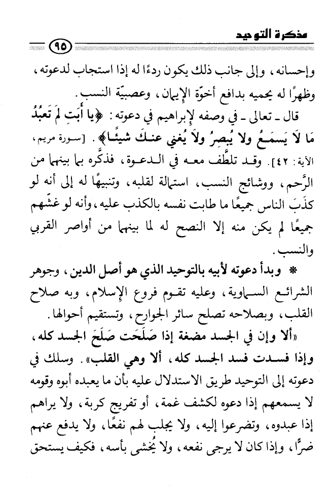 قال- تعالى- في وصف إبراهيم في دعوته: {يَا أَبَتِ إِنِّي أَخَافُ أَنْ يَمَسَّكَ عَذَابٌ مِنَ الرَّحْمَنِ فَتَكُونَ لِلشَّيْطَانِ وَلِيًّا} [مريم: 45]